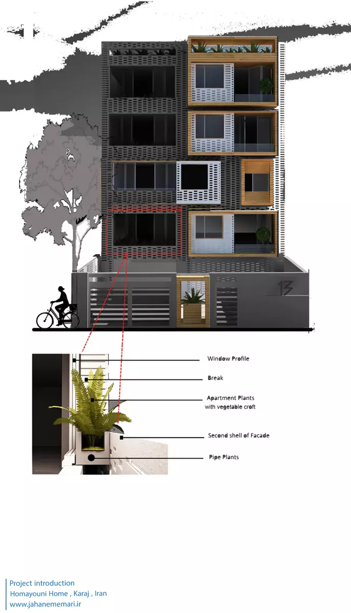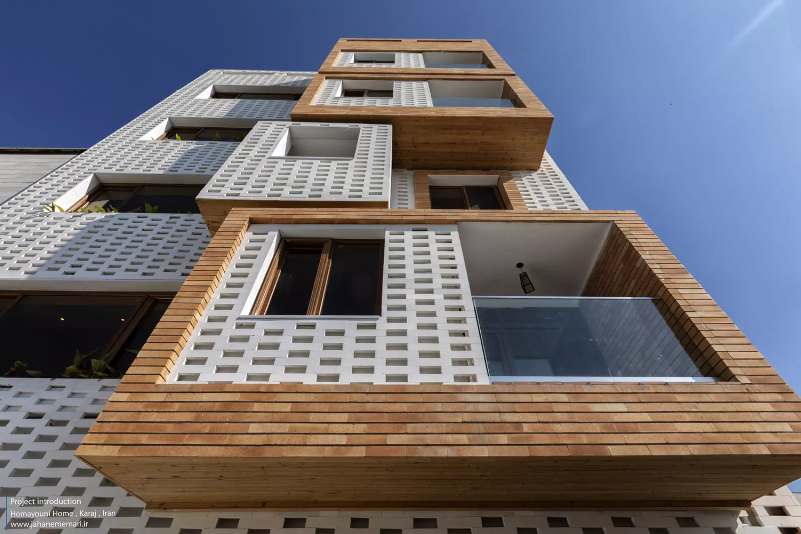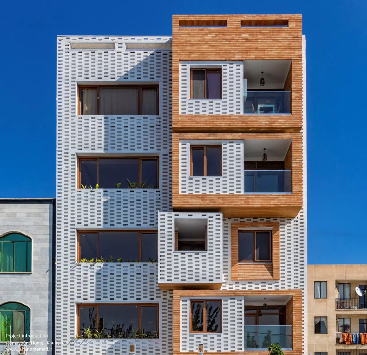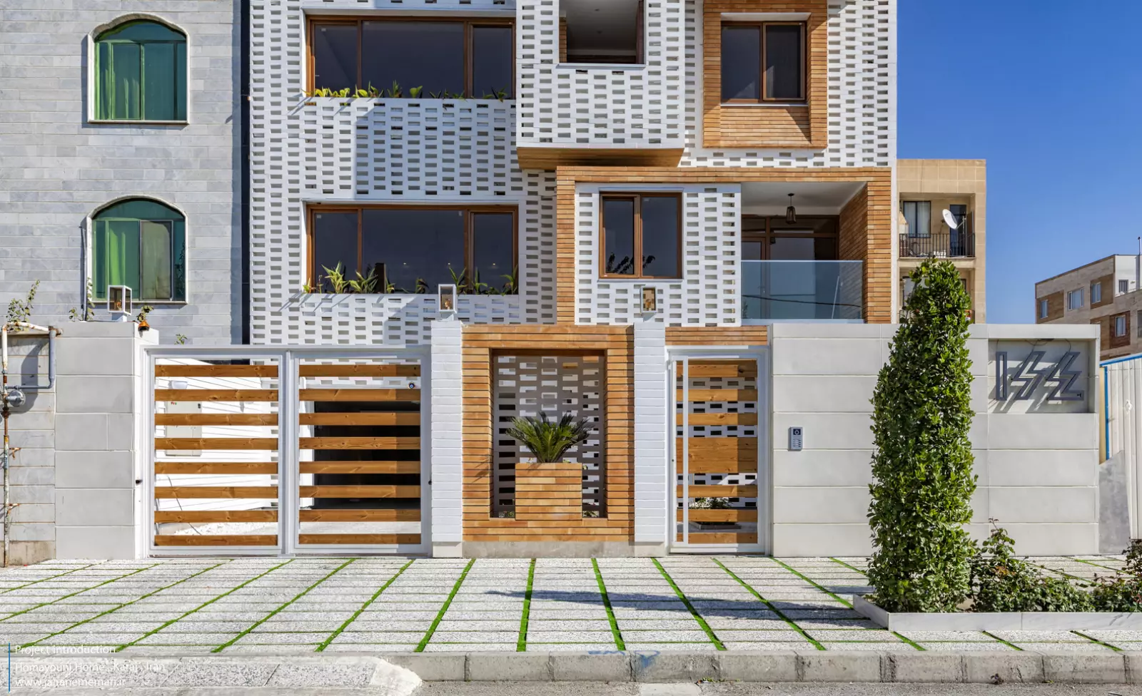 نمای پروژه: طراحی آجرهای مشبک ایرانی به همراه مکعب های تراس که از قلب ساختمان بر آمده اند، ترکیبی مناسب، استاندارد و چشم نوازی را ایجاد کرده اند. اجرای نما با آجرهای مشبک سفید در فاصله بیست سانتی متر از نمای اصلی که میل به ایجاد نمای دو پوسته را ایجاد می کند و با توجه به موقعیت مکانی باعث تهویه مناسب و ورود هوای تازه به فضا می شود. وجود آجرهای پنج سانتی متری با فاصله بیست سانتی متر مهار می شوند تا بدین ترتیب دیگر نیازی به استفاده مداوم از وسایل برودتی نباشد و انتخاب رنگ سفید حاکی از اصرار طراح بر میزان و تعادل دما و حتی صرفه جویی در هزینه های زندگی در ساختمان می باشد.