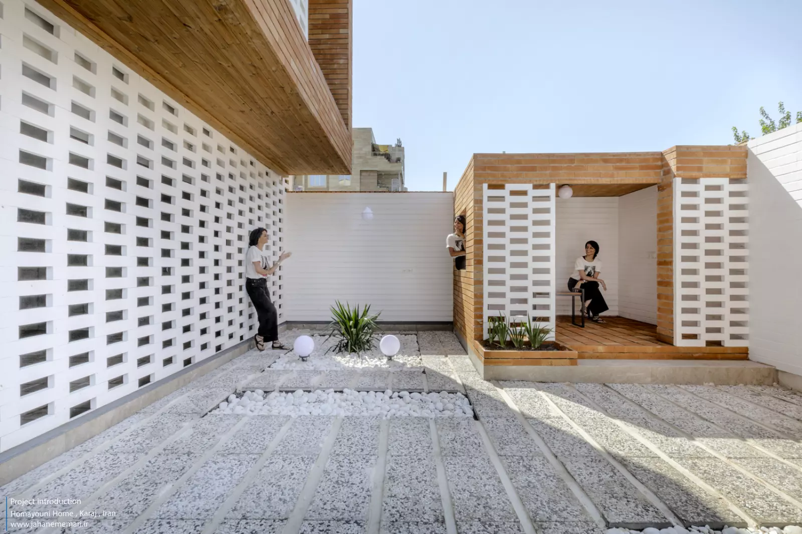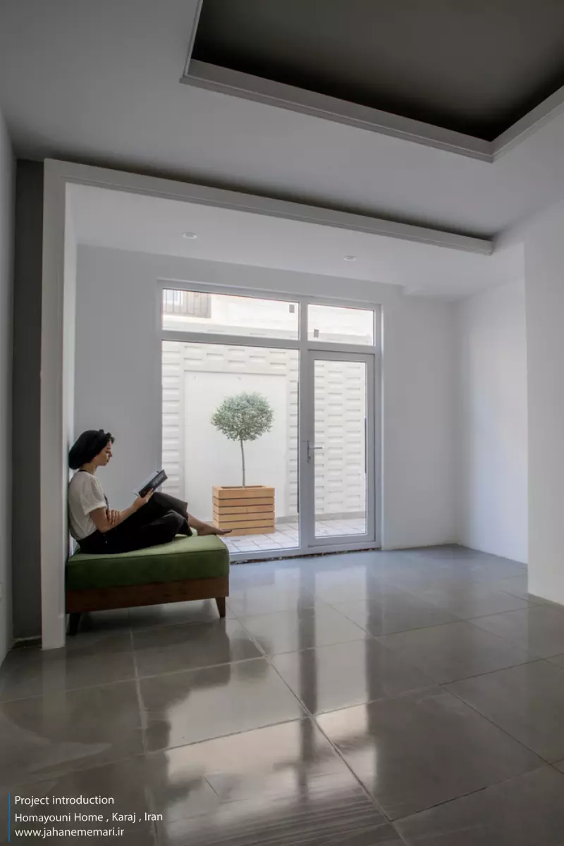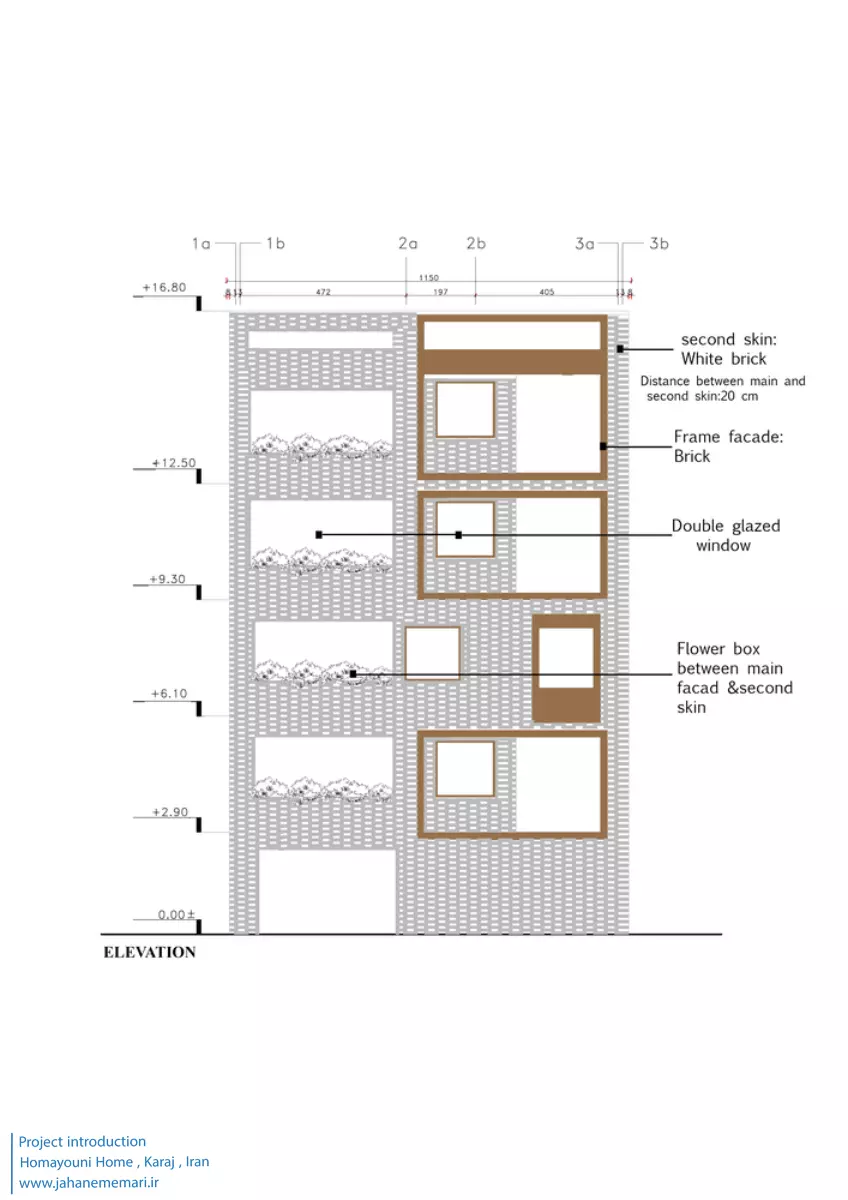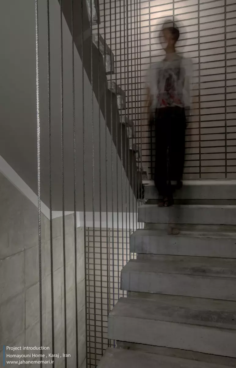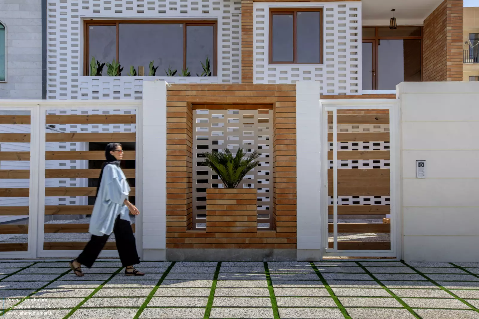 نمای پروژه: طراحی آجرهای مشبک ایرانی به همراه مکعب های تراس که از قلب ساختمان بر آمده اند، ترکیبی مناسب، استاندارد و چشم نوازی را ایجاد کرده اند. اجرای نما با آجرهای مشبک سفید در فاصله بیست سانتی متر از نمای اصلی که میل به ایجاد نمای دو پوسته را ایجاد می کند و با توجه به موقعیت مکانی باعث تهویه مناسب و ورود هوای تازه به فضا می شود. وجود آجرهای پنج سانتی متری با فاصله بیست سانتی متر مهار می شوند تا بدین ترتیب دیگر نیازی به استفاده مداوم از وسایل برودتی نباشد و انتخاب رنگ سفید حاکی از اصرار طراح بر میزان و تعادل دما و حتی صرفه جویی در هزینه های زندگی در ساختمان می باشد.
