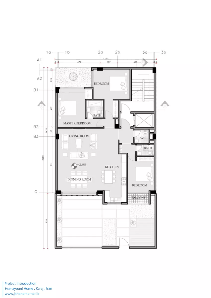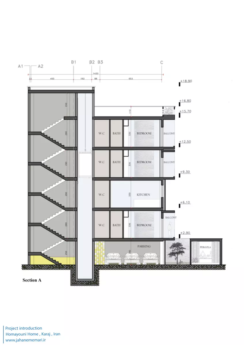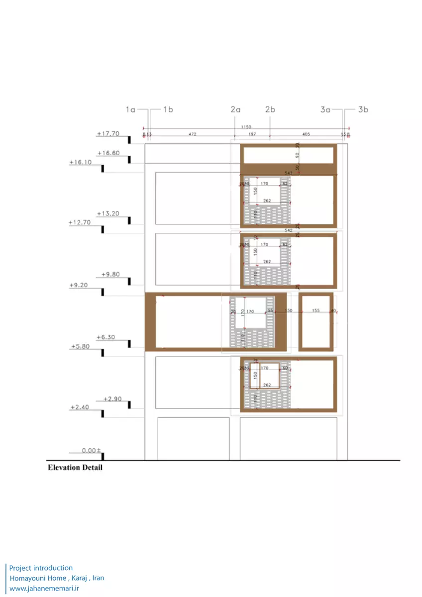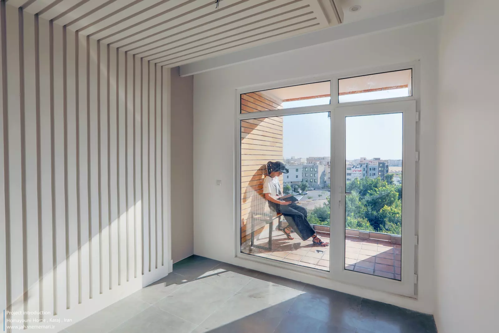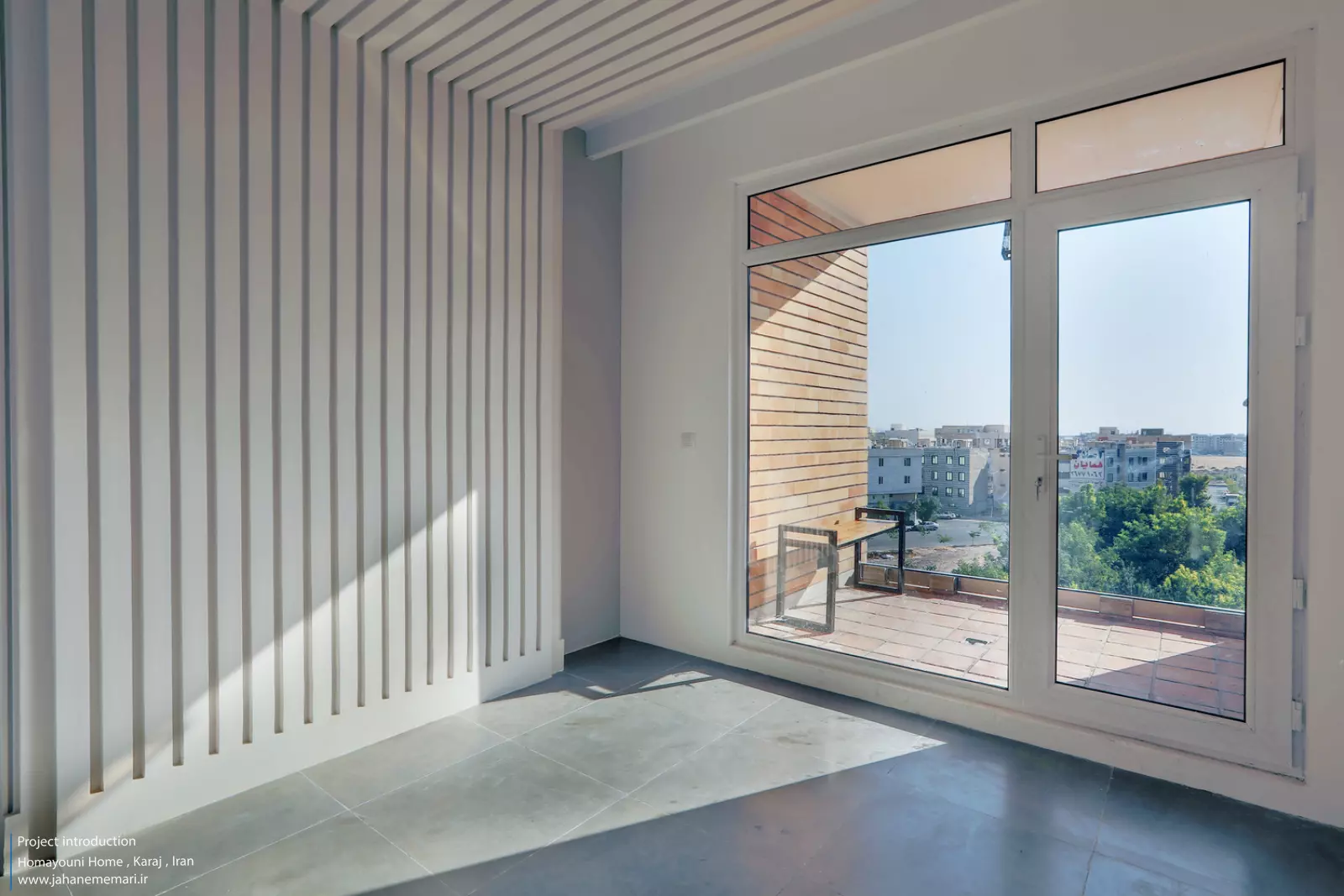 نمای پروژه: طراحی آجرهای مشبک ایرانی به همراه مکعب های تراس که از قلب ساختمان بر آمده اند، ترکیبی مناسب، استاندارد و چشم نوازی را ایجاد کرده اند. اجرای نما با آجرهای مشبک سفید در فاصله بیست سانتی متر از نمای اصلی که میل به ایجاد نمای دو پوسته را ایجاد می کند و با توجه به موقعیت مکانی باعث تهویه مناسب و ورود هوای تازه به فضا می شود. وجود آجرهای پنج سانتی متری با فاصله بیست سانتی متر مهار می شوند تا بدین ترتیب دیگر نیازی به استفاده مداوم از وسایل برودتی نباشد و انتخاب رنگ سفید حاکی از اصرار طراح بر میزان و تعادل دما و حتی صرفه جویی در هزینه های زندگی در ساختمان می باشد.