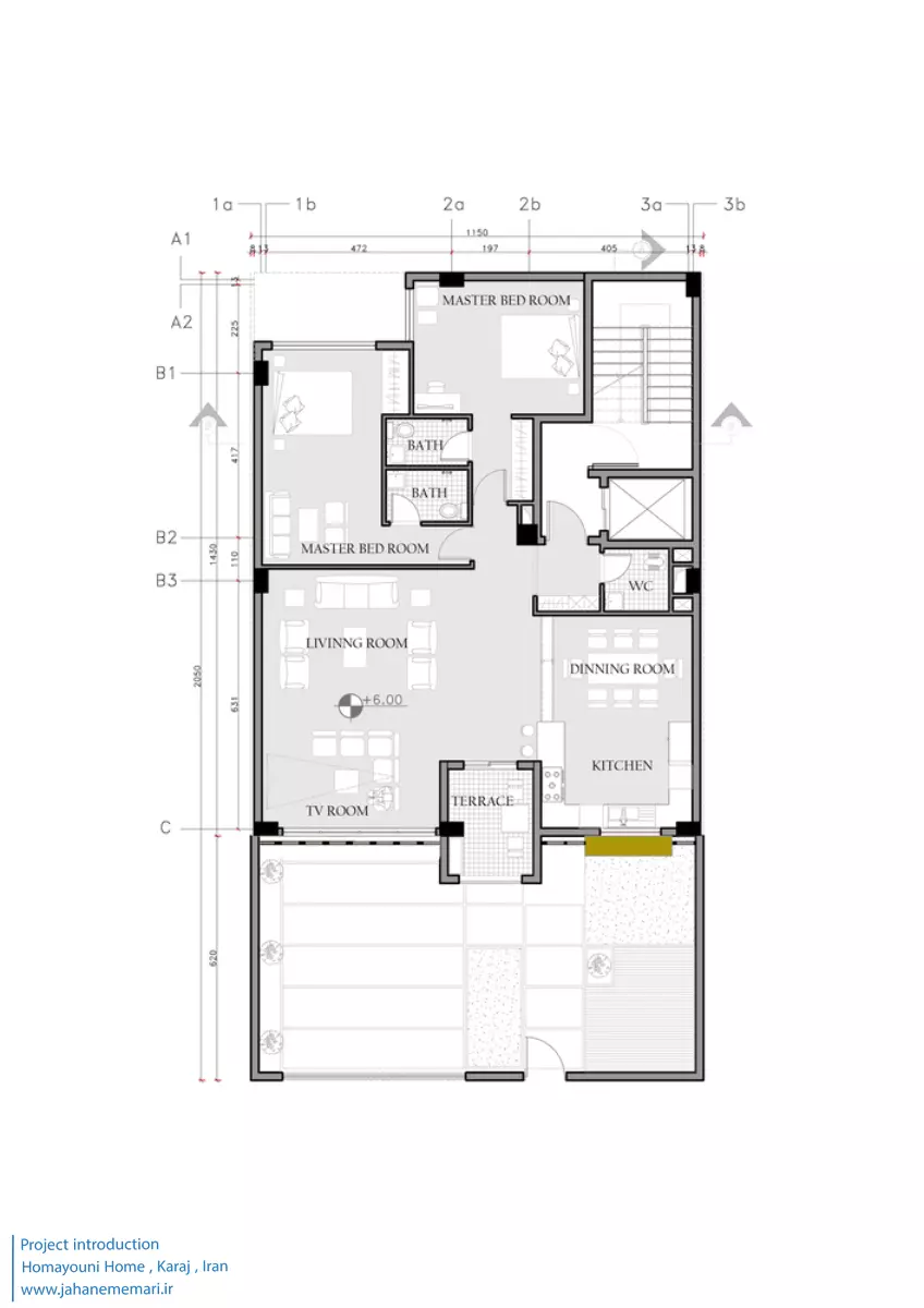 ایده های طراحی: چالش های این پروژه طراحی واحدی با دو اتاق مستر و یک بالکن با اندازه مشخص است که بتواند سلیقه و نیازهای یک خانواده هنرمند را برآورده کند و سه واحد دیگر علاوه بر دو اتاق مستر، دارای یک اتاق مجزا به چشم انداز رو به باغچه باشند. لازم به ذکر است که یکی از خواسته های کارفرمای پروژه ایجاد طرح و مشخصات متفاوت و منحصر به فرد برای هر واحد بوده است.