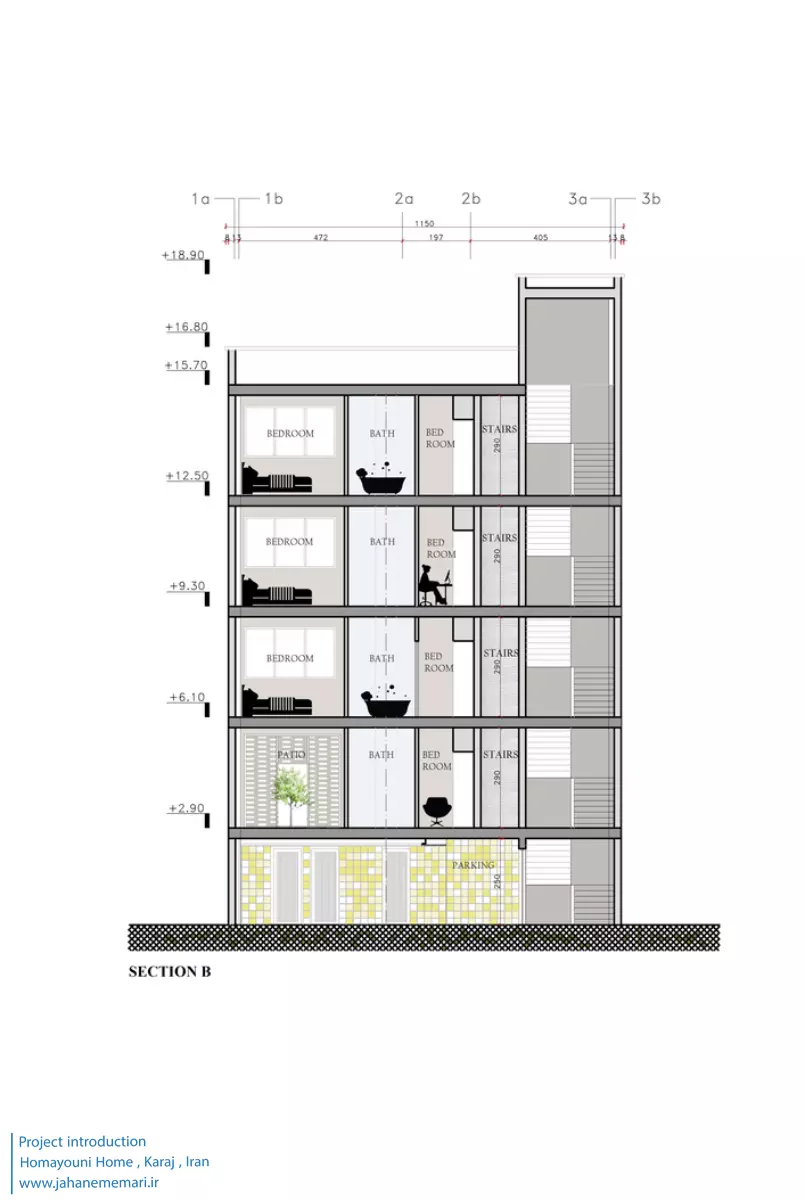 این پروژه شامل یک ساختمان مسکونی می باشد که در چهار طبقه طراحی شده و هر طبقه دارای یک واحد می باشد که در ادامه به شرح آن ها خواهیم پرداخت. این ساختمان با توجه به موقعیت و مساحت ملک، دارای ویژگی های منحصر به فردی از جمله عرض کم است. از نظر مسکن و موقعیت اجتماعی نیز در فضای میانه شهری کرج واقع شده است.