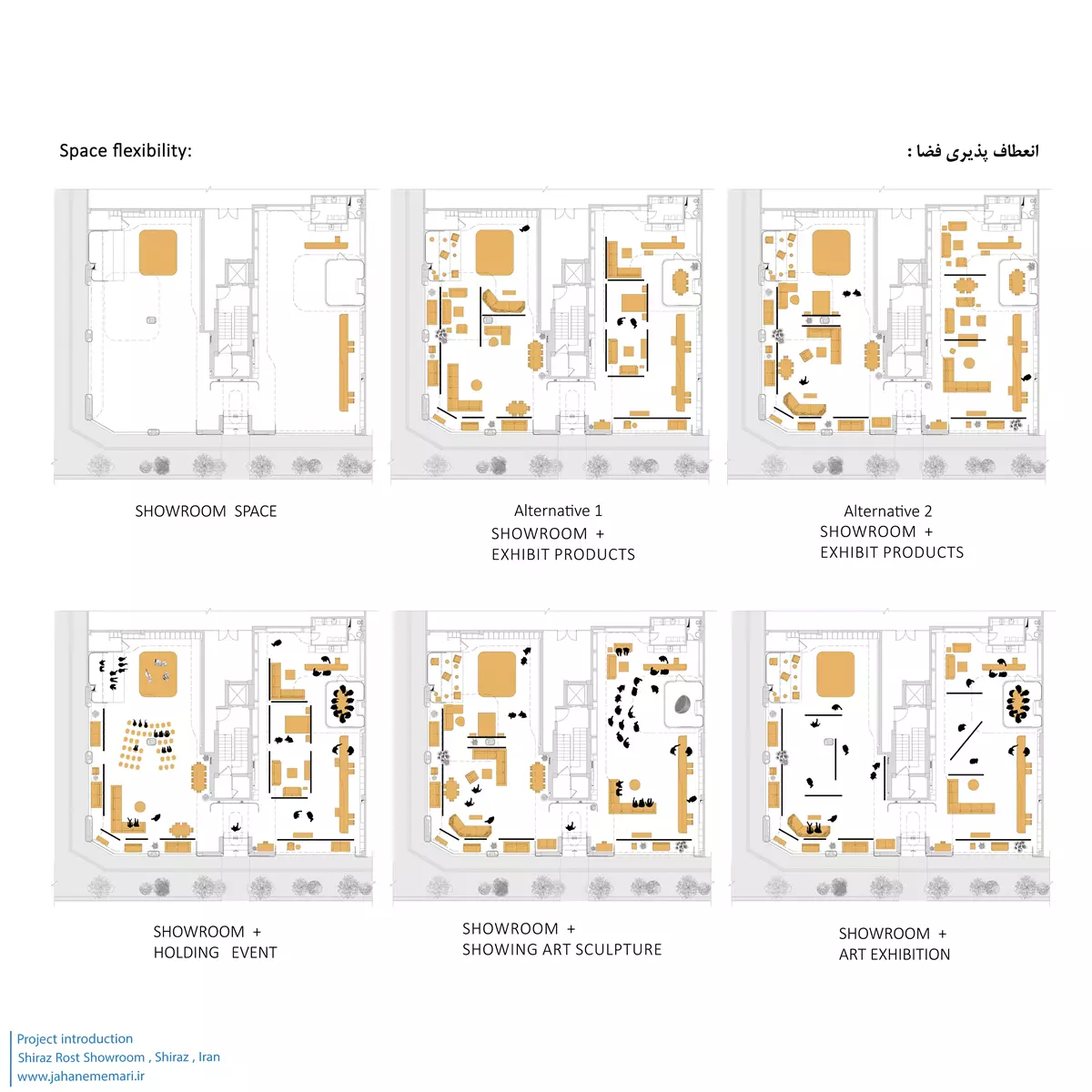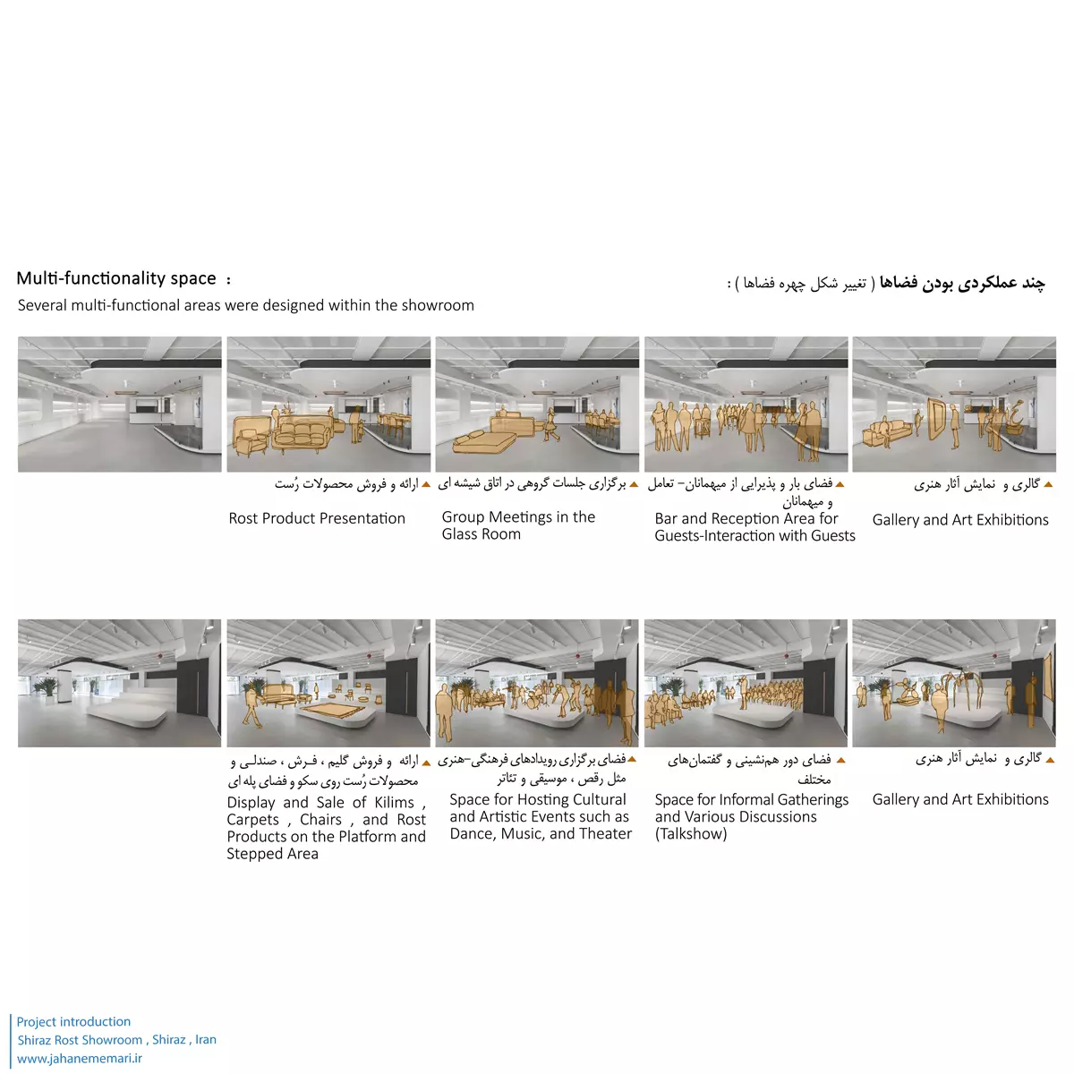اغلب نمایشگاهها یا showroom، فضایی برای ارائه، فروش محصولات و ارتباط مستقیم با مشتریان تعریف میشوند. سوالی که پیش میآید: آیا شرکتهای تولیدی بزرگ، در نمایشگاههای خود میتوانند به فعالیتی فراتر از ارائه و فروشِ محصول بپردازند؟ با توجه به مشکلاتی که در برگزاری رویدادهای مختلف در فضاهای عمومی و نمایشگاههای دولتی در ایران وجود دارد، منجر به کاهش مشارکت متخصصان حرفهای و علاقهمندان شده است و مدتهاست که رویدادهای موفق حرفه ای، فرهنگی و هنری در شهری همچون شیراز کمتر دیده میشود. در پی پاسخ به این دغدغه، این سوال طرح شد: آیا نمایشگاههای خصوصی متعلق به شرکتهای بزرگ، میتوانند بستر تعاملی برای حمایت و برگزاری چنین رویدادهایی باشند؟ بر اساس پرسشهای مطرح شده، ایدههای زیر در نظر گرفته شد.
