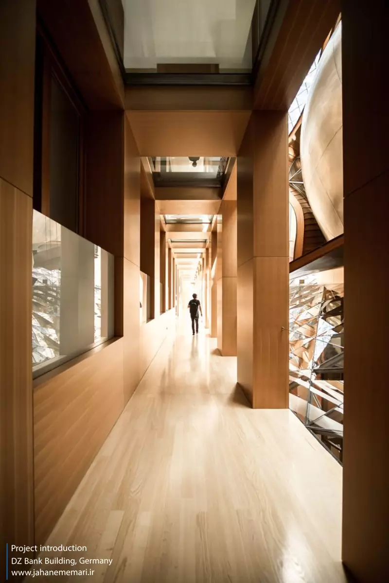 یک رواق با پوشش چوبی مسیر رسیدن به لابیهای آسانسورهای اداری را که در دو سوی آتریوم قرار دارند تأمین میکند. فضاهای اداری پیرامون آتریوم سازماندهی شدهاند و به سمت داخل جهتگیری دارند تا از نور طبیعی فراوانی که از سقف شیشهای وارد فضا میشود بهرهمند شوند.