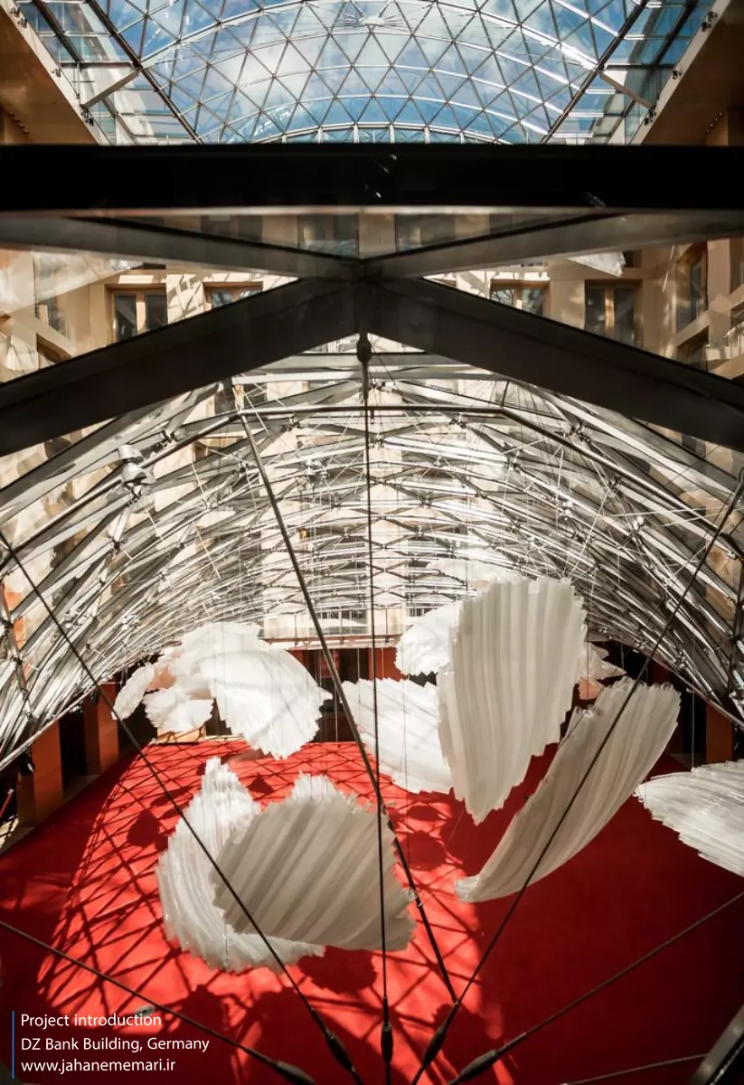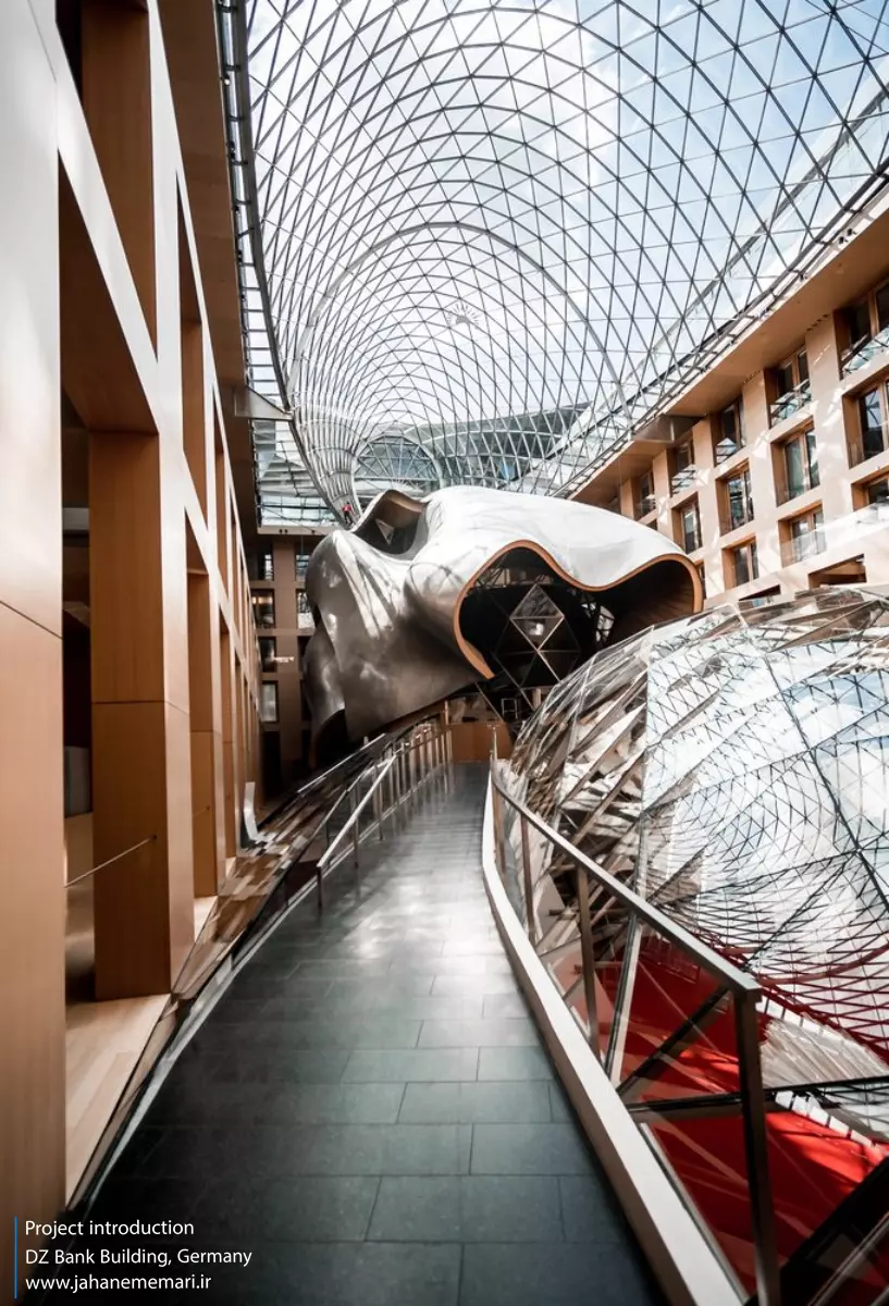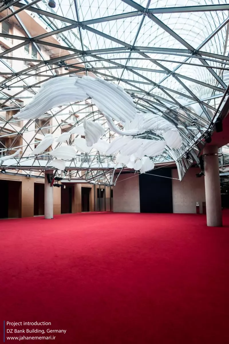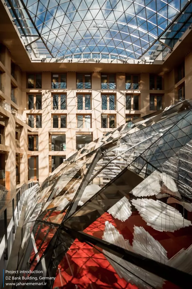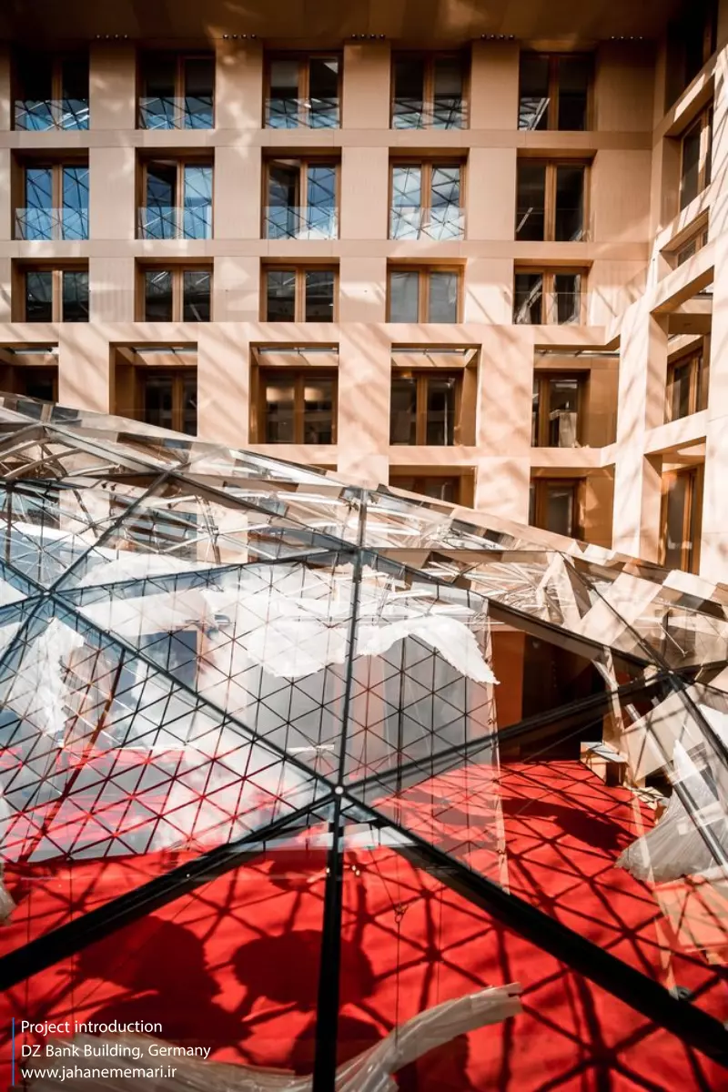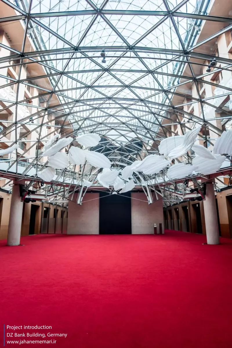 یک سایبان شیشهای ورودی اصلی از سمت «پاریزر پلاتس» را میپوشاند. بلافاصله پس از ورود، یک فویۀ بلندمرتبه قرار گرفته است که دیدی مستقیم به آتریوم بزرگ داخلی بنا فراهم میکند؛ آتریومی که دارای سقف شیشهای منحنی و کف شیشهای منحنی است.