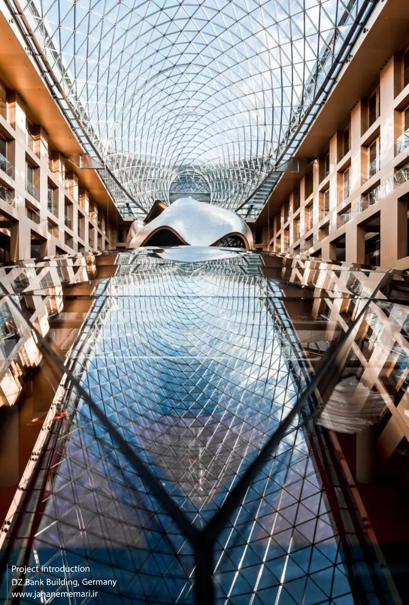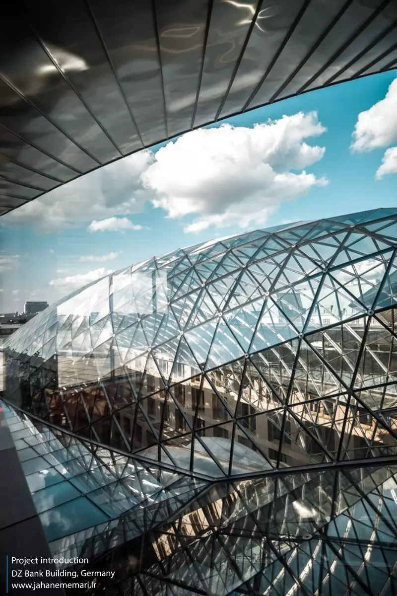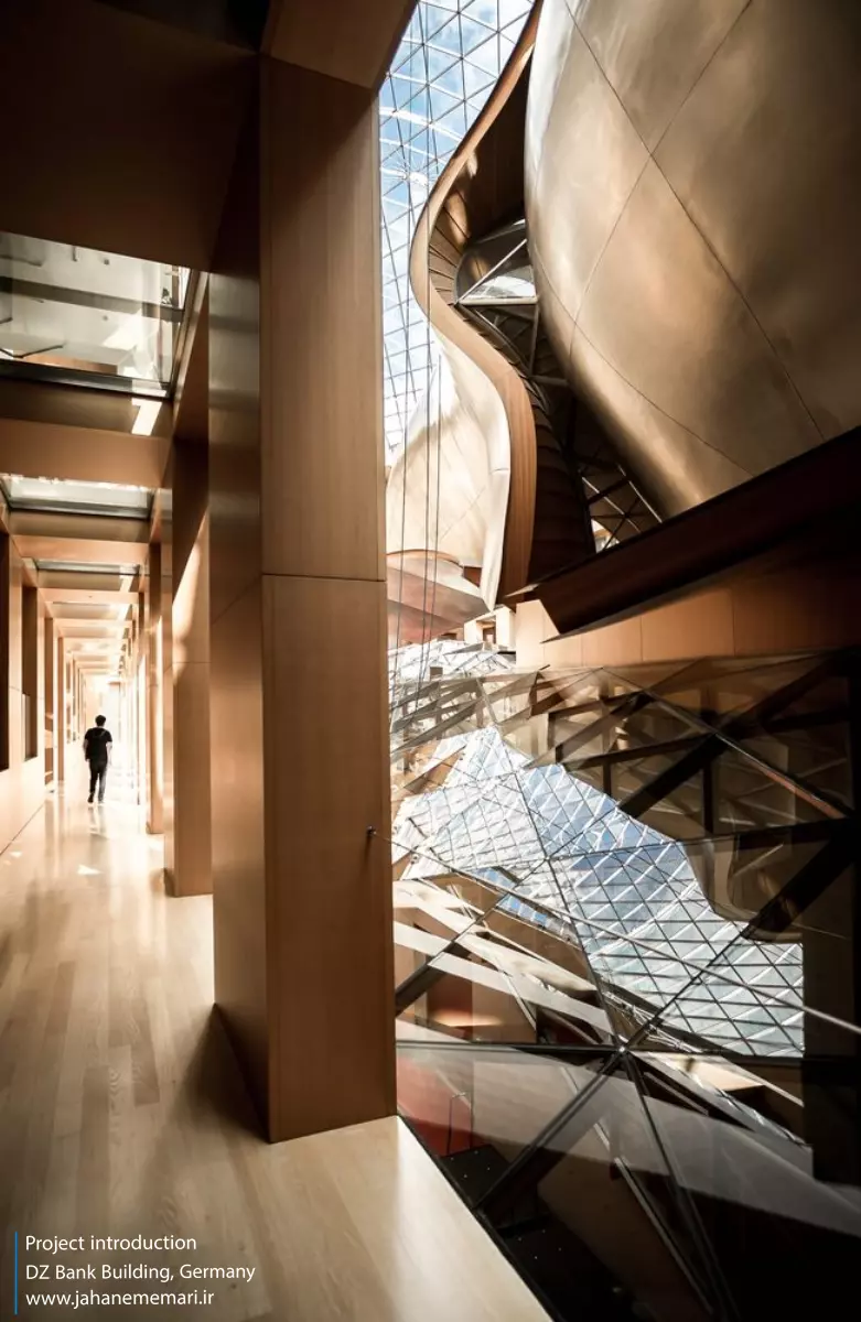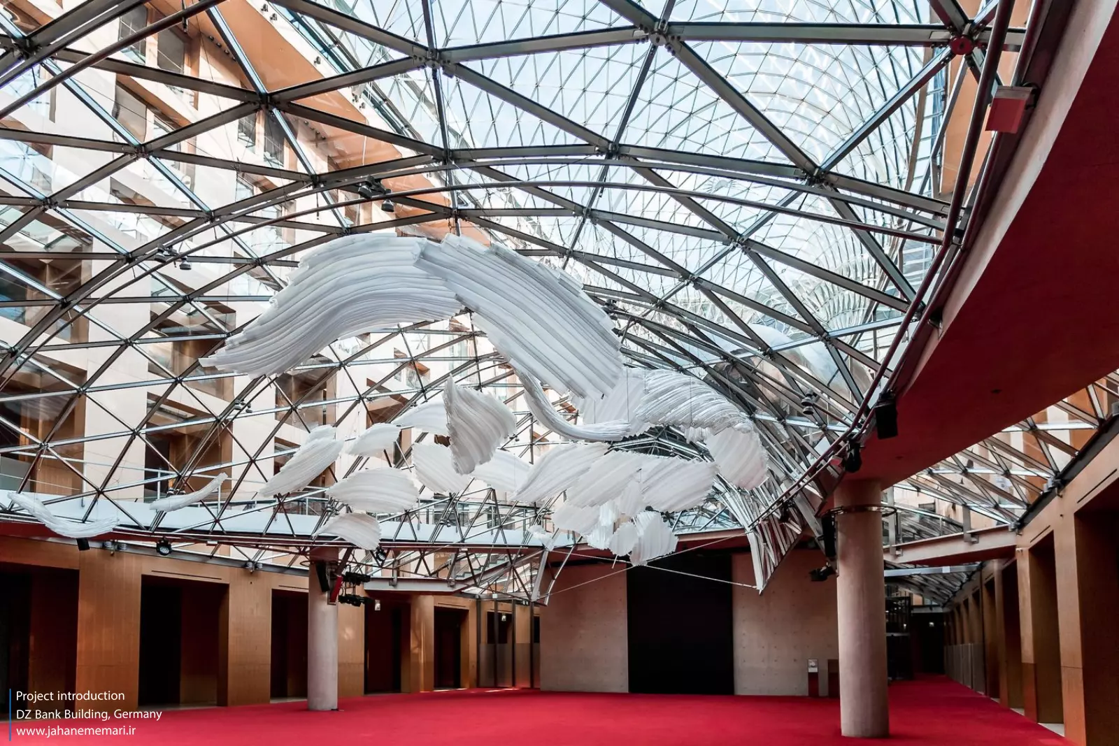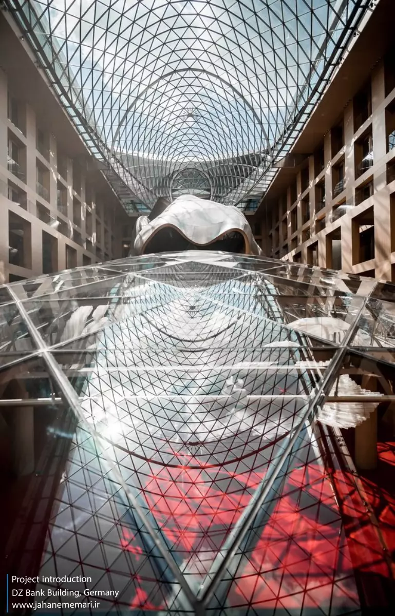 یک سایبان شیشهای ورودی اصلی از سمت «پاریزر پلاتس» را میپوشاند. بلافاصله پس از ورود، یک فویۀ بلندمرتبه قرار گرفته است که دیدی مستقیم به آتریوم بزرگ داخلی بنا فراهم میکند؛ آتریومی که دارای سقف شیشهای منحنی و کف شیشهای منحنی است.