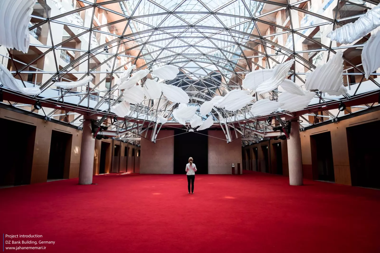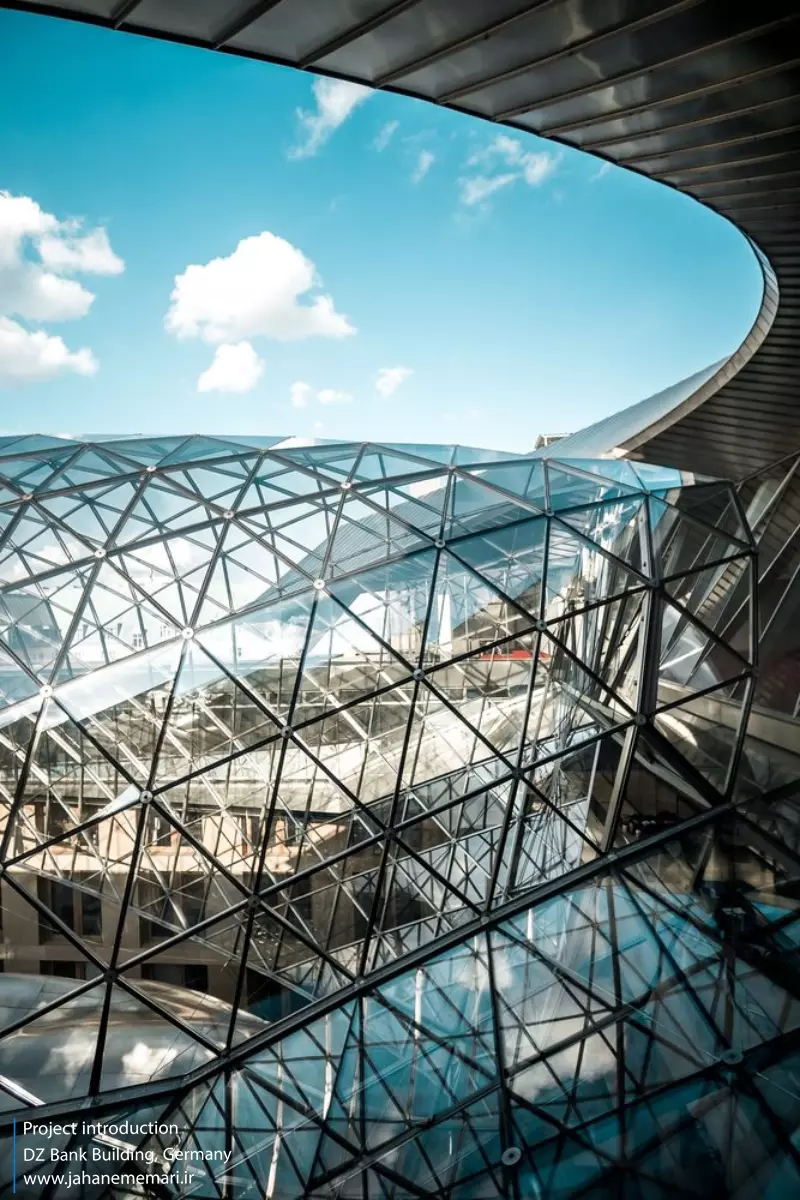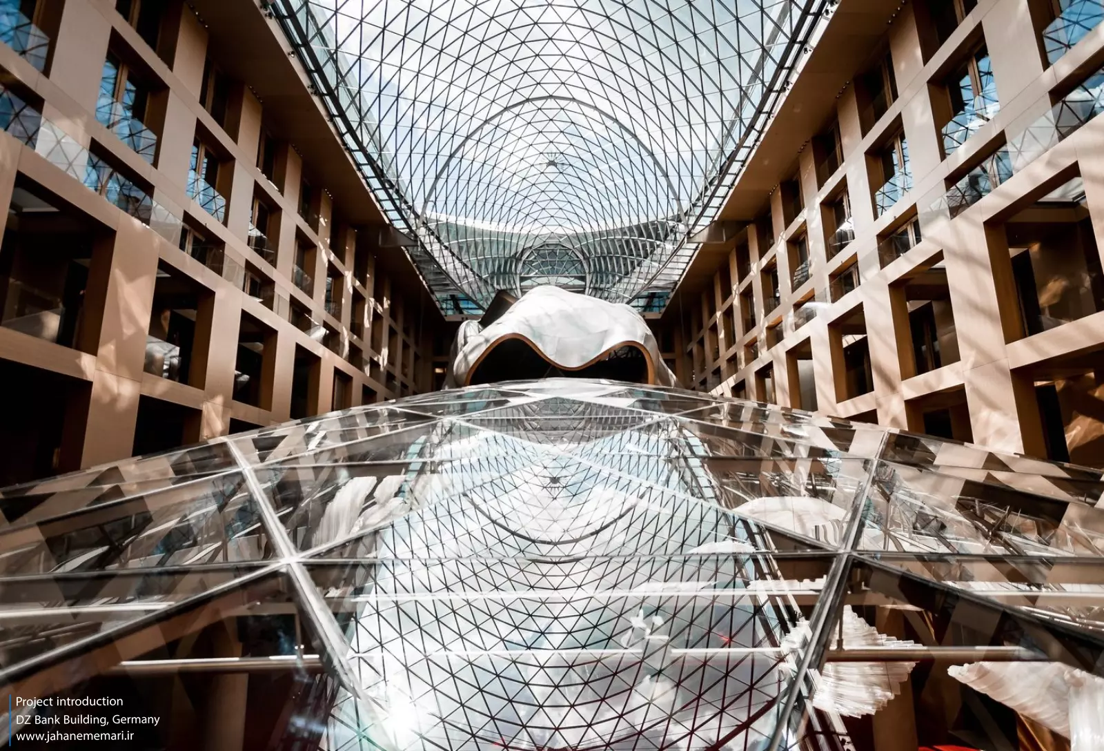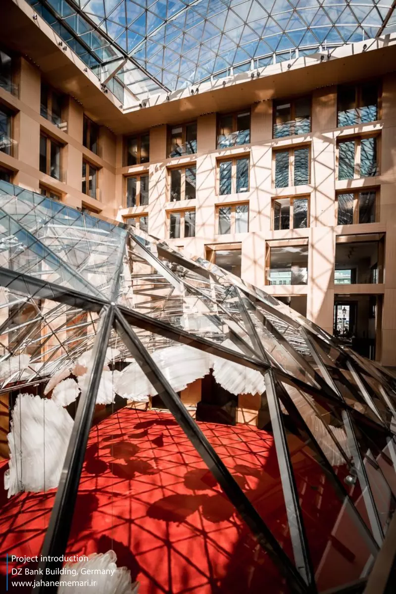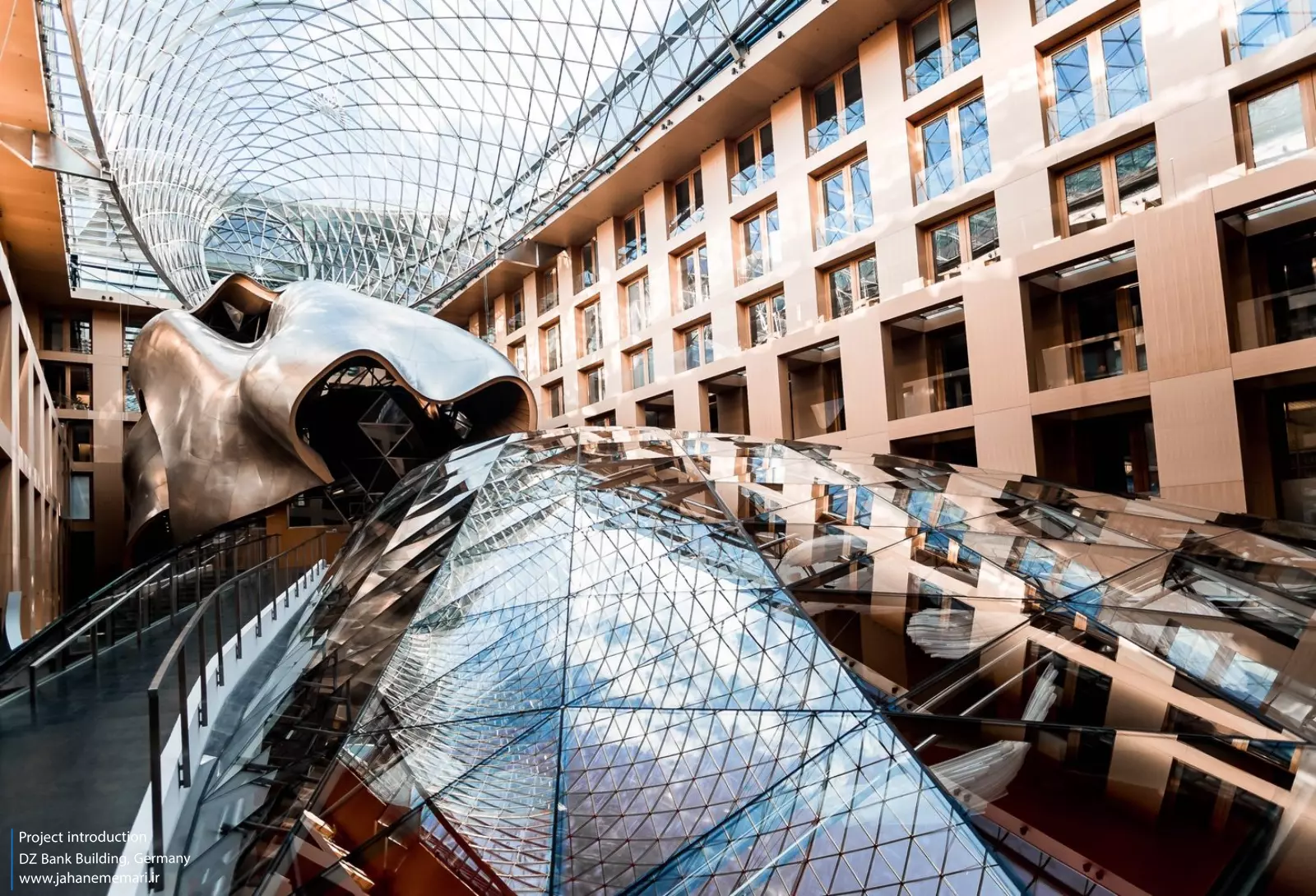 یک سایبان شیشهای ورودی اصلی از سمت «پاریزر پلاتس» را میپوشاند. بلافاصله پس از ورود، یک فویۀ بلندمرتبه قرار گرفته است که دیدی مستقیم به آتریوم بزرگ داخلی بنا فراهم میکند؛ آتریومی که دارای سقف شیشهای منحنی و کف شیشهای منحنی است.