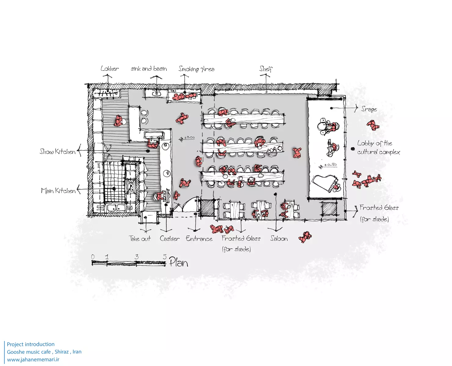 پس از چند جلسه با مالک مجتمع که از طرفداران پروپاقرص موسیقی و تئاتر است، سوال پروژه را تعریف کردیم: چگونه می توانیم فضایی دلپذیر و خصوصی برای هنرمندان ایجاد کنیم و در عین حال تعاملی بین داخل و خارج کافه ایجاد کنیم. هدف این بود که به فضای کافه تجاوز نکنیم.