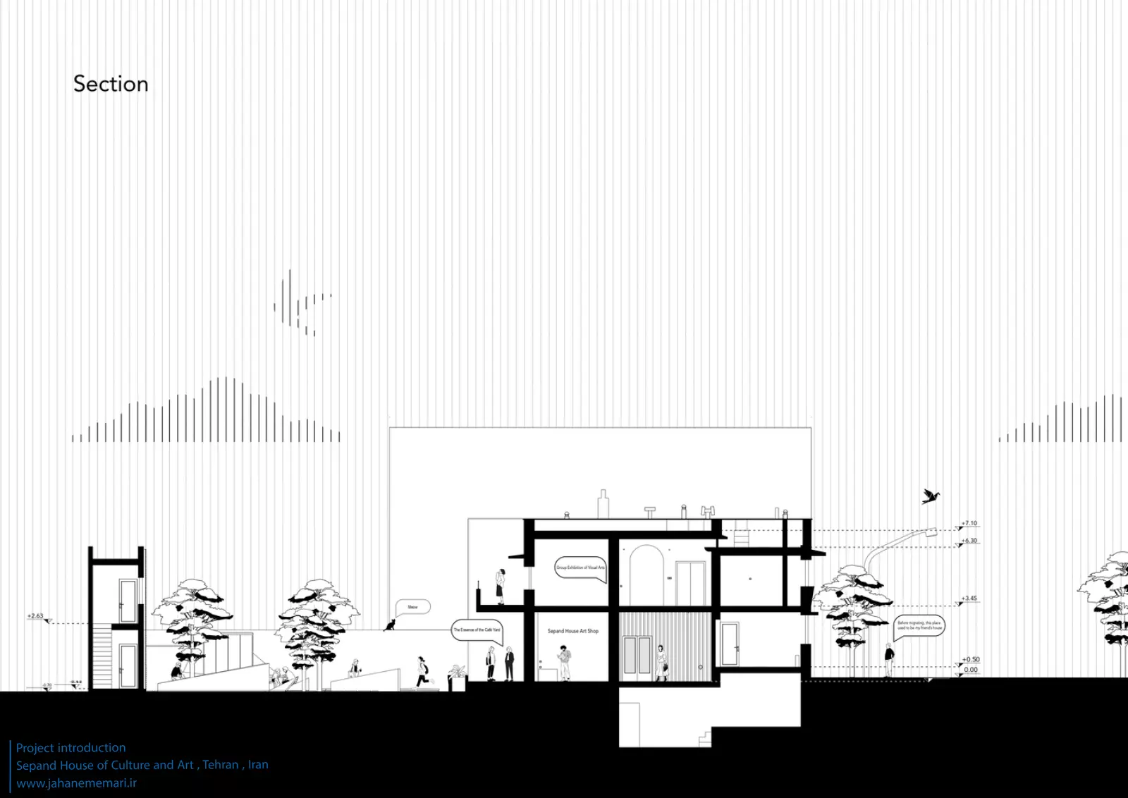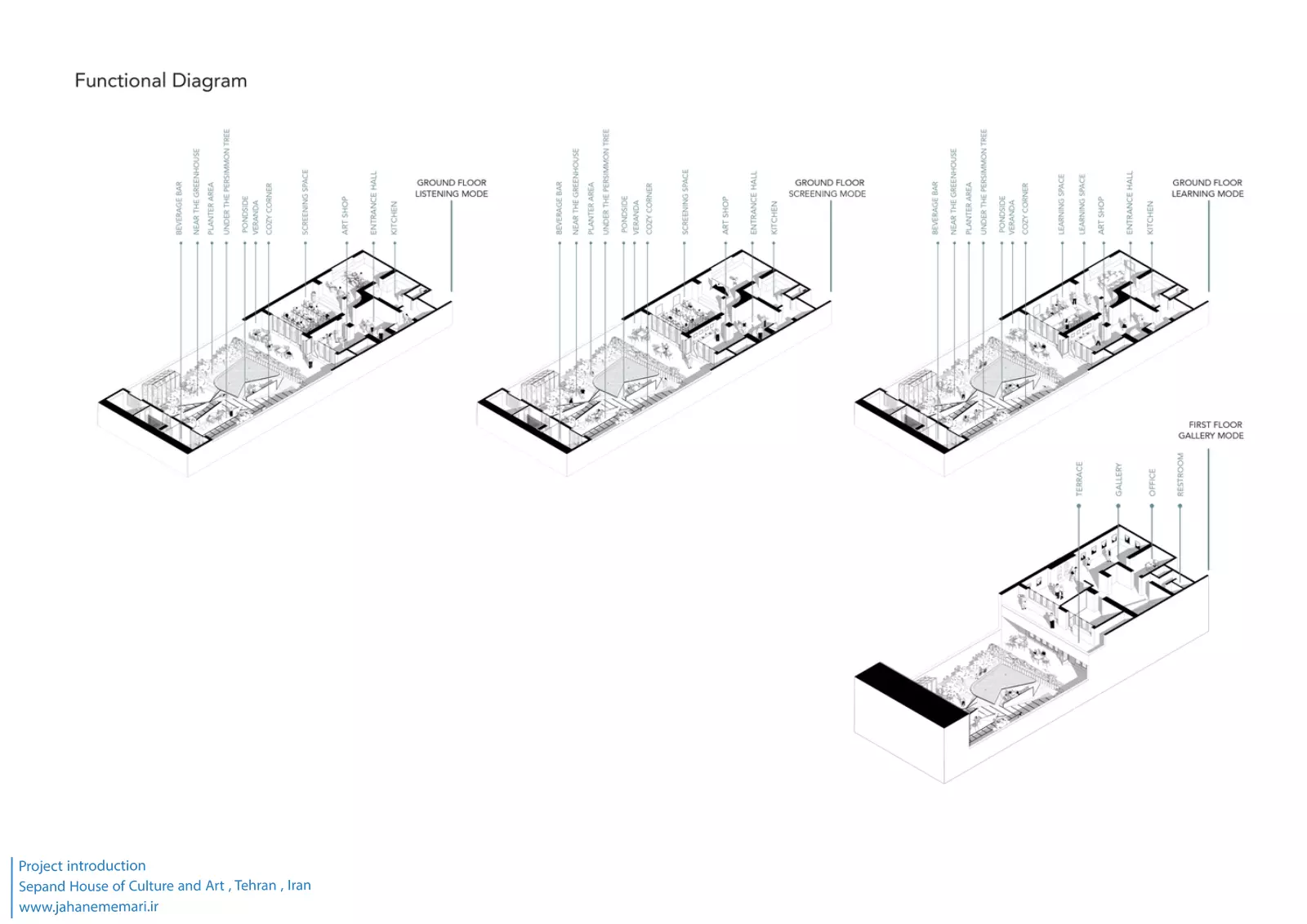 در این مجموعه، گالری به طبقهٔ اول منتقل شد تا فضایی بازتر و انعطافپذیرتر برای مخاطبان فراهم کند. در همین حال، تالار پذیرش طبقهٔ همکف—with اختلاف سطحهای موجود—به یک فرصت تبدیل شد: صحنهای پویا و چندلایه برای اجراهای زنده، نمایش فیلم و کارگاهها. بدین ترتیب، فضاها شخصیت جدیدی یافتند—جایی میان گذشته و حال—که در آن، زندگی جمعی از خلال تجربههای فرهنگی معاصر بازآفرینی میشود.
