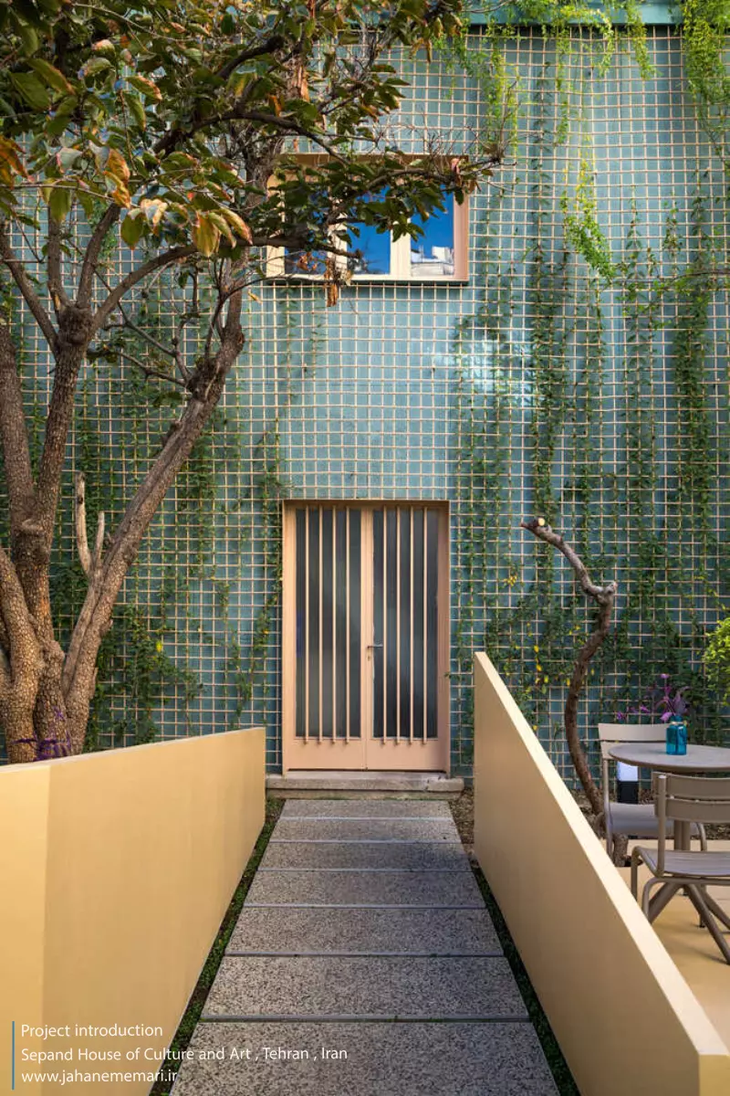 ساختمان کوچکتر خدمه، که زمانی فرسوده و کهنه بود، با یک پوشش مشبک فلزی احاطه شد که میزبان گیاهان بالارونده است. این پوستۀ ثانویه گذشته را محو نمیکند، بلکه آن را از طریق یک فرآیند زنده به آینده پیوند میزند.