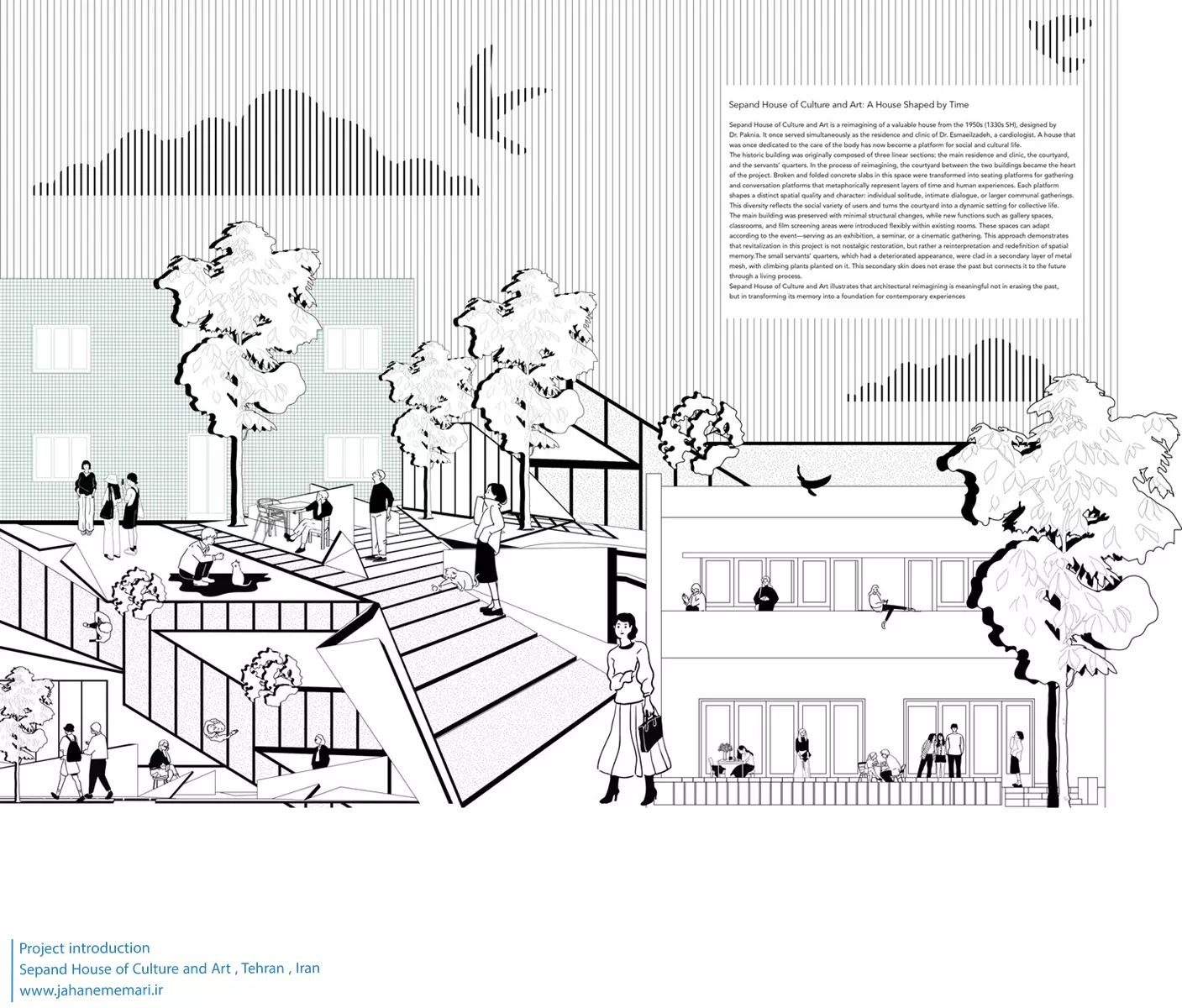 خانه فرهنگ و هنر سپند نمایانگر احیای یک اقامتگاه ارزشمند از دههٔ ۱۹۶۰ است؛ خانهای که در اصل توسط دکتر پاکنیا طراحی شده بود. این بنا که زمانی منزل و مطب دکتر اسماعیلزاده، متخصص قلب، بود، اکنون از مکانی برای مراقبت جسمانی به بستری برای فرهنگ و اجتماع تبدیل شده است.