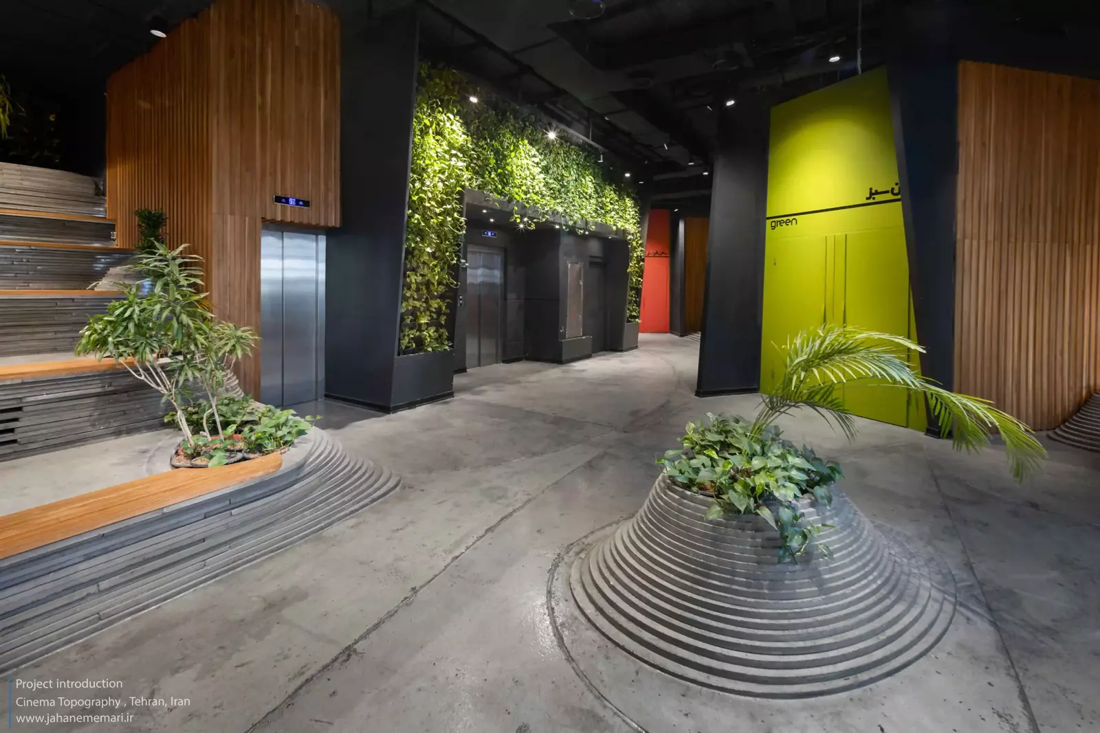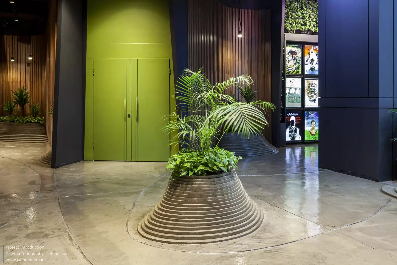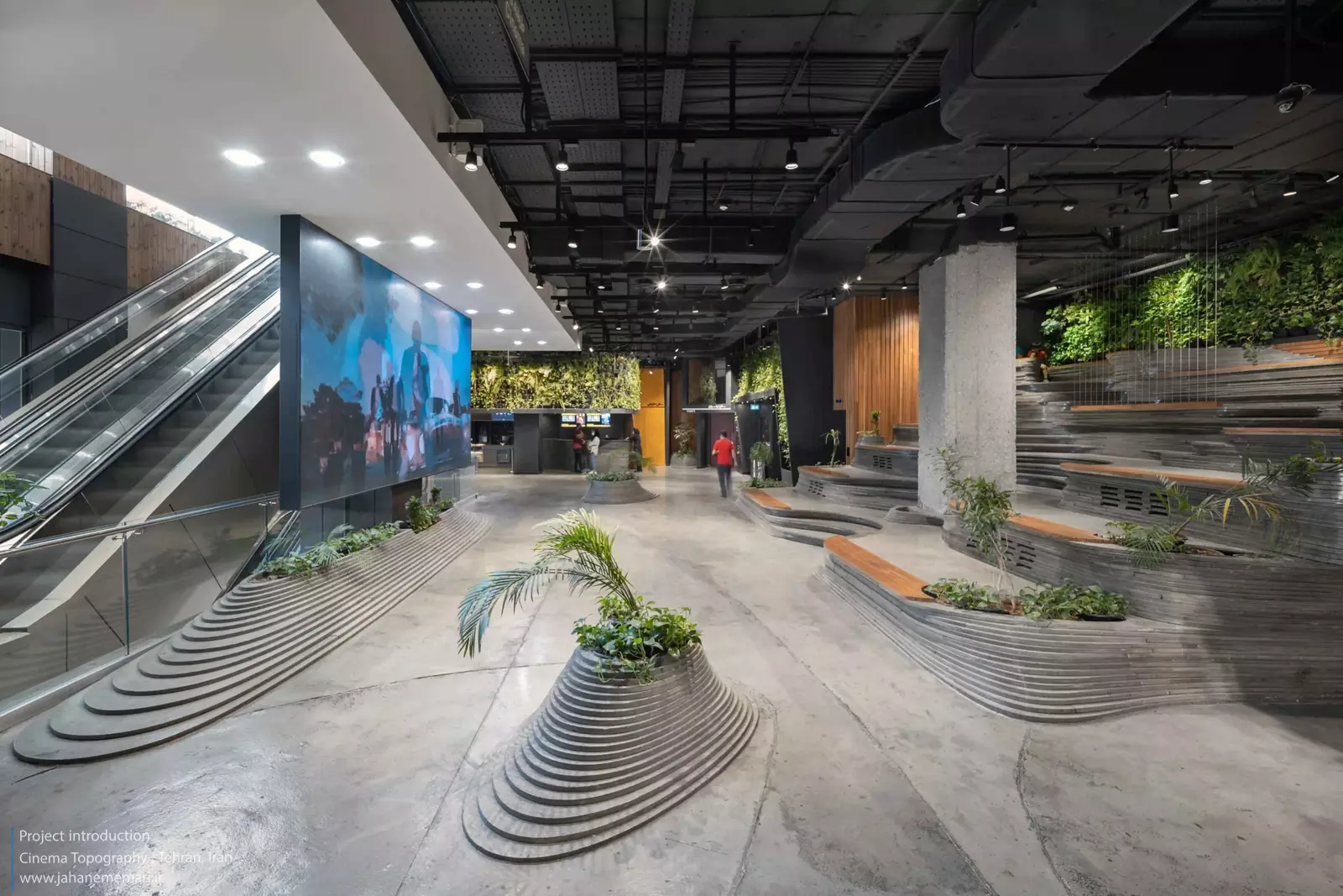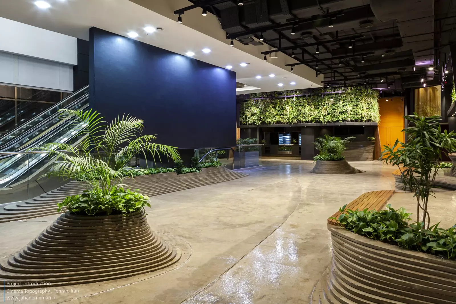فرم خطوط توپوگرافی در طراحی ابژه های عملکردی همچون، کانترهای بلیط فروشی و تنقلات و گلدان هایی که در قسمت های مختلف لابی طراحی شده نیز استفاده شده است. شبیه سازی محیط طبیعی و خلق یک لنداسکیپ داخلی با طراحی دیوارهای سبز، جداره های منحنی سالن های سینما از جنس نوارهای چوبی، تقویت شده است.