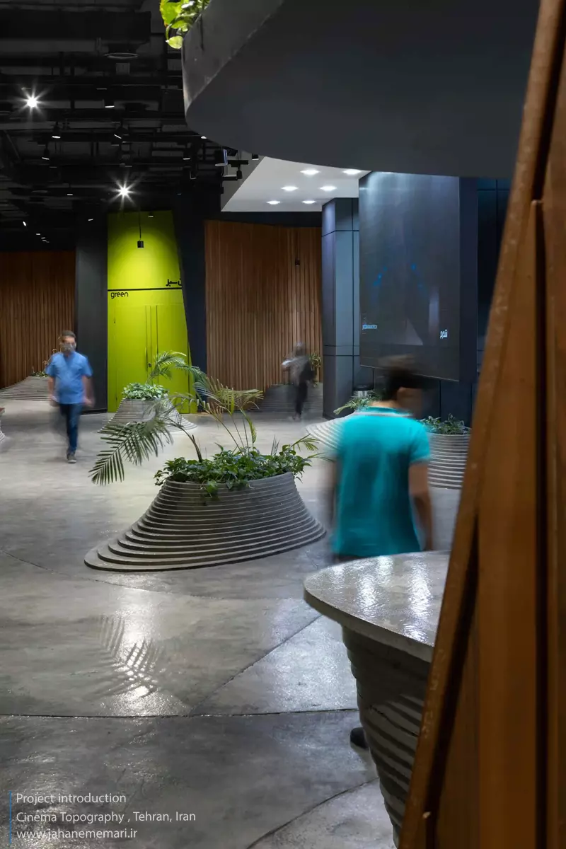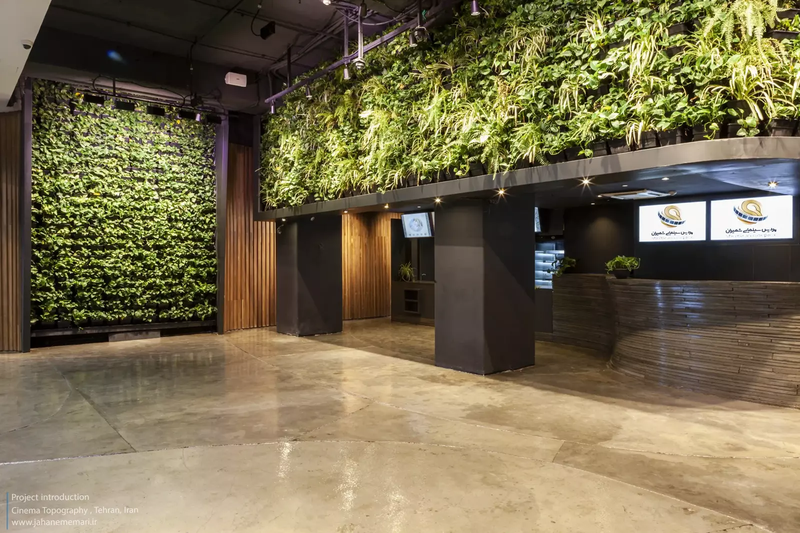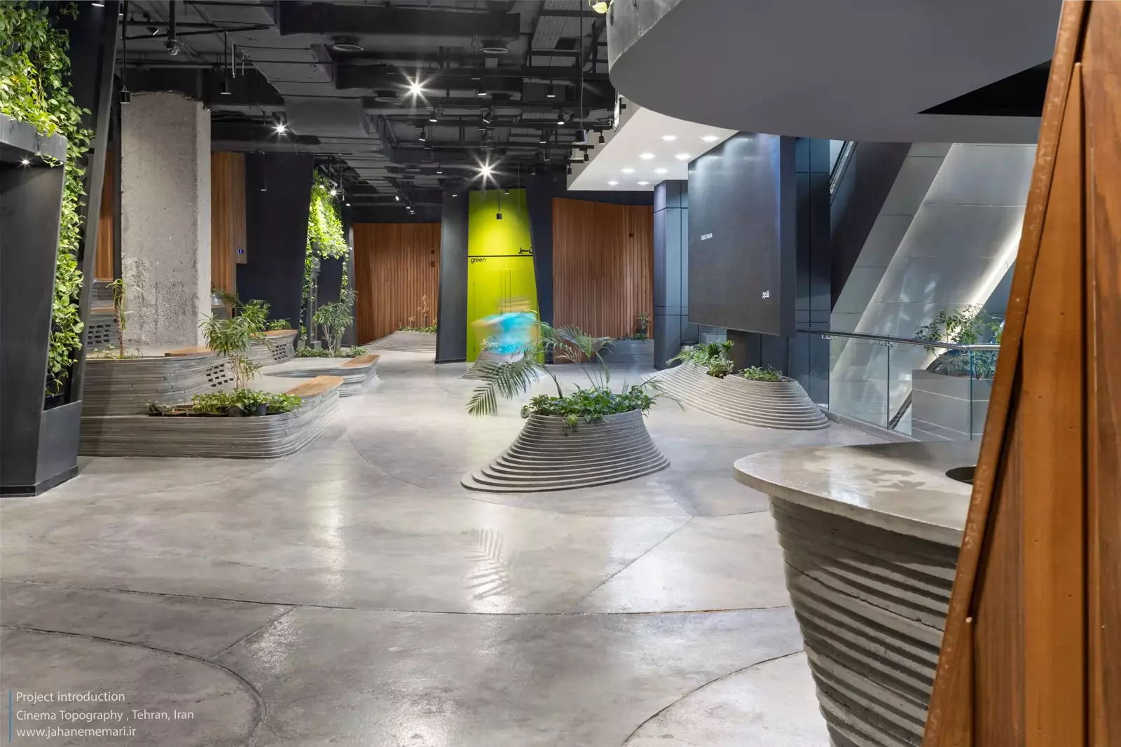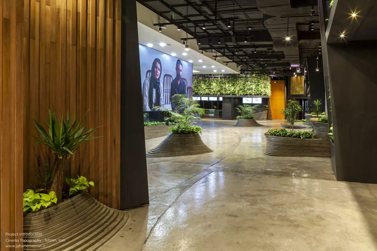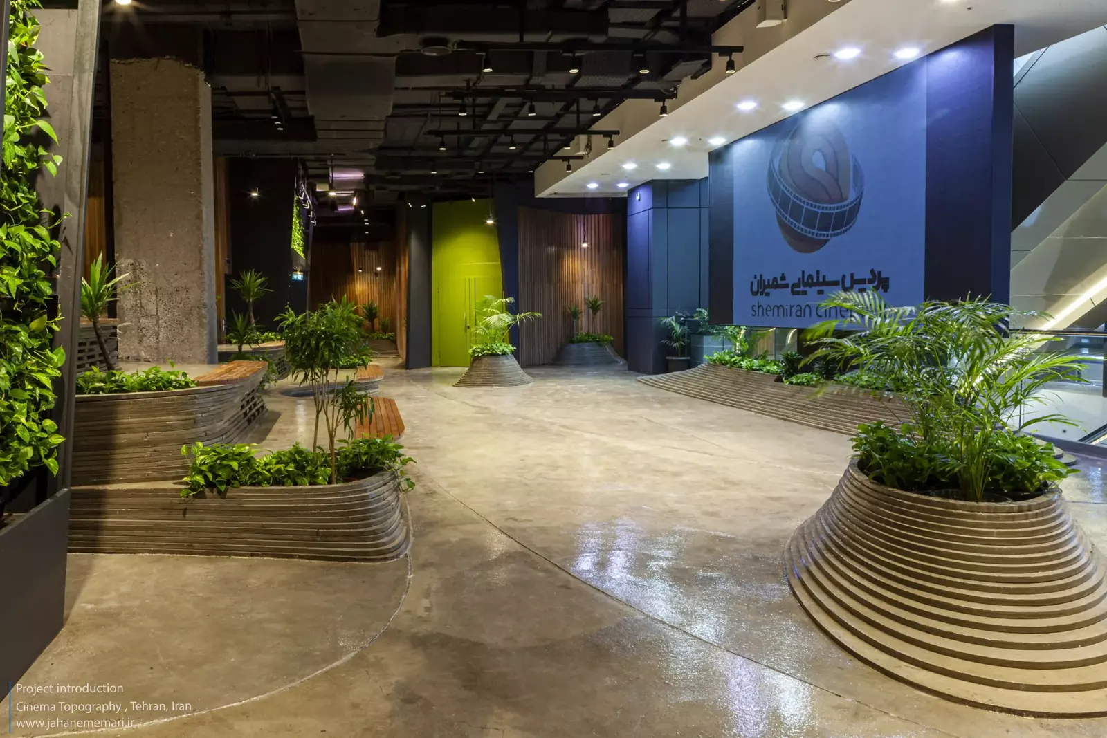 فرم خطوط توپوگرافی در طراحی ابژه های عملکردی همچون، کانترهای بلیط فروشی و تنقلات و گلدان هایی که در قسمت های مختلف لابی طراحی شده نیز استفاده شده است. شبیه سازی محیط طبیعی و خلق یک لنداسکیپ داخلی با طراحی دیوارهای سبز، جداره های منحنی سالن های سینما از جنس نوارهای چوبی، تقویت شده است.