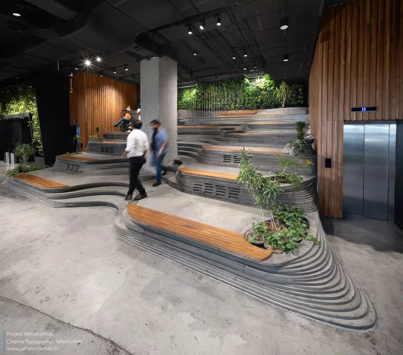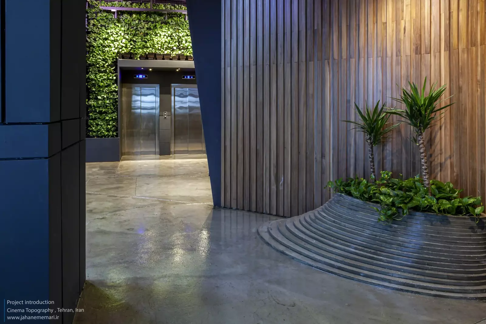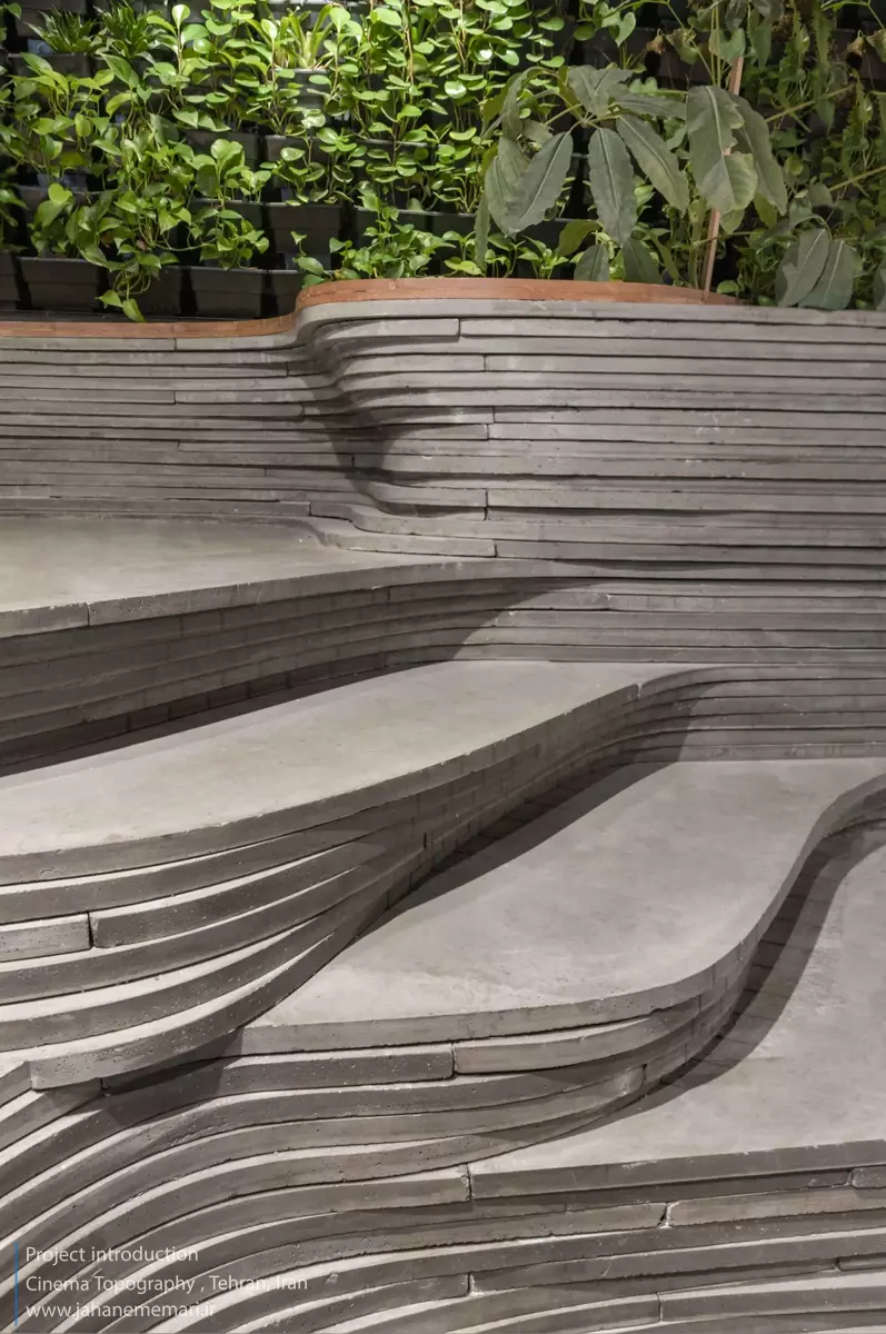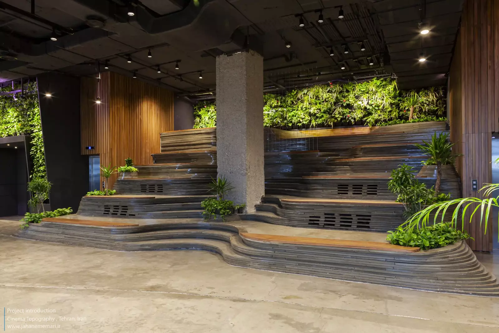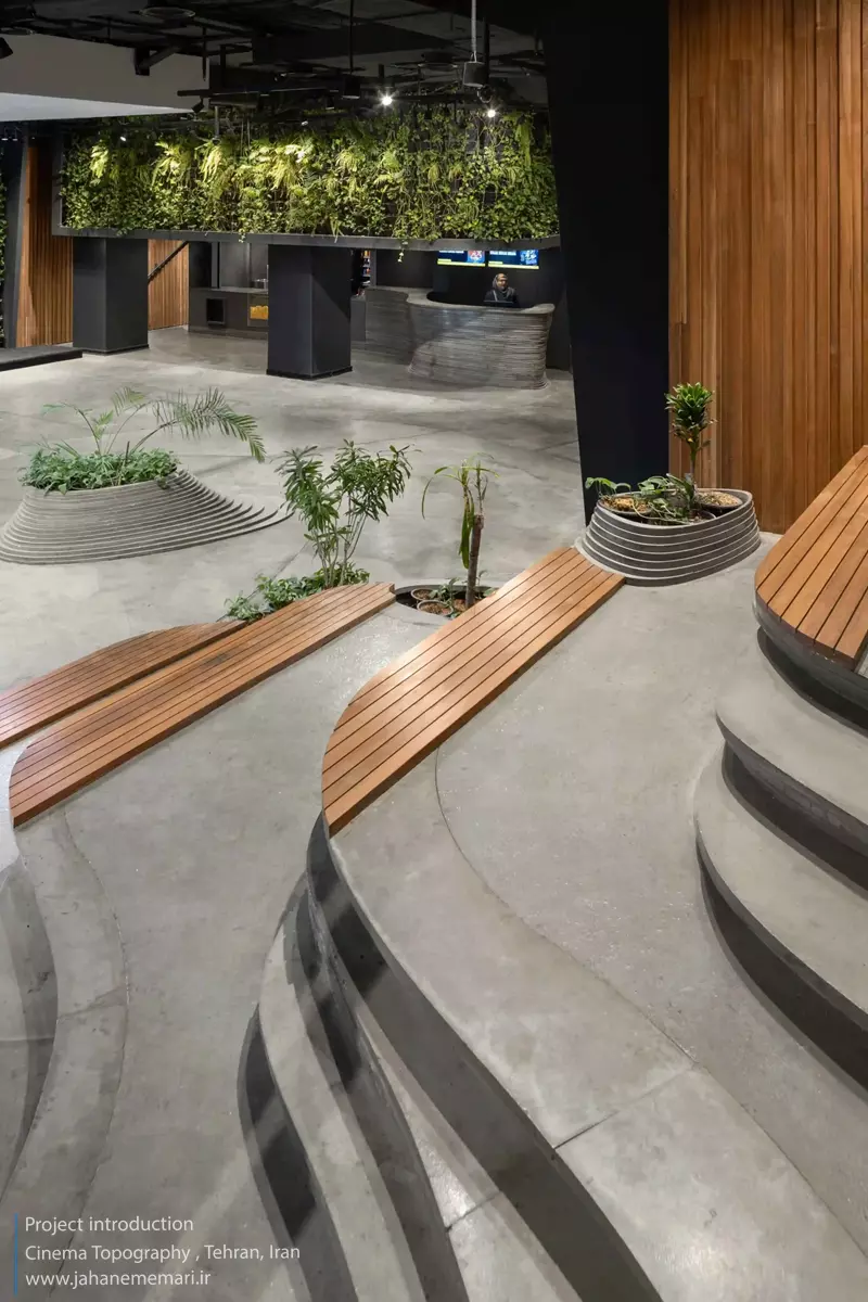 فرم خطوط توپوگرافی در طراحی ابژه های عملکردی همچون، کانترهای بلیط فروشی و تنقلات و گلدان هایی که در قسمت های مختلف لابی طراحی شده نیز استفاده شده است. شبیه سازی محیط طبیعی و خلق یک لنداسکیپ داخلی با طراحی دیوارهای سبز، جداره های منحنی سالن های سینما از جنس نوارهای چوبی، تقویت شده است.