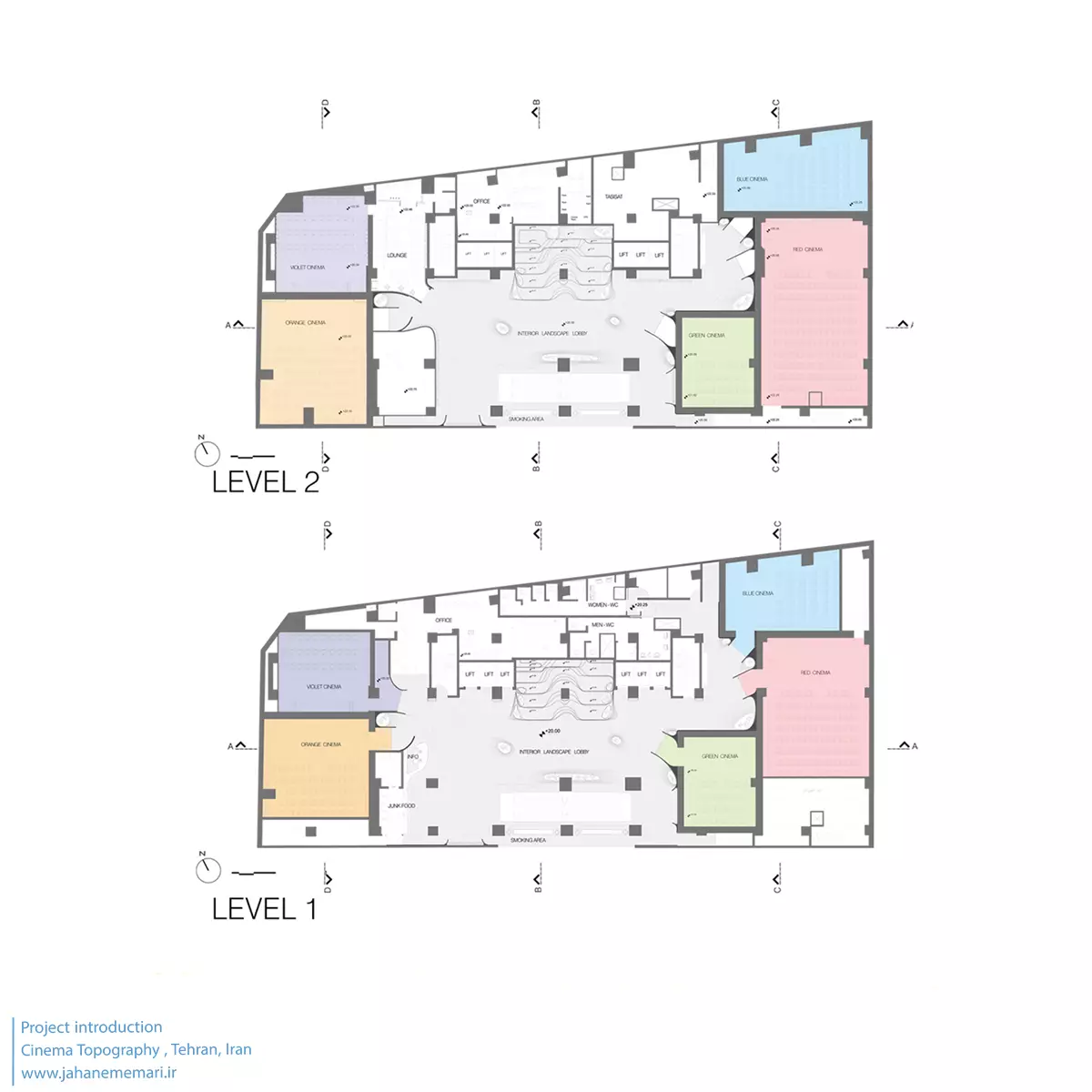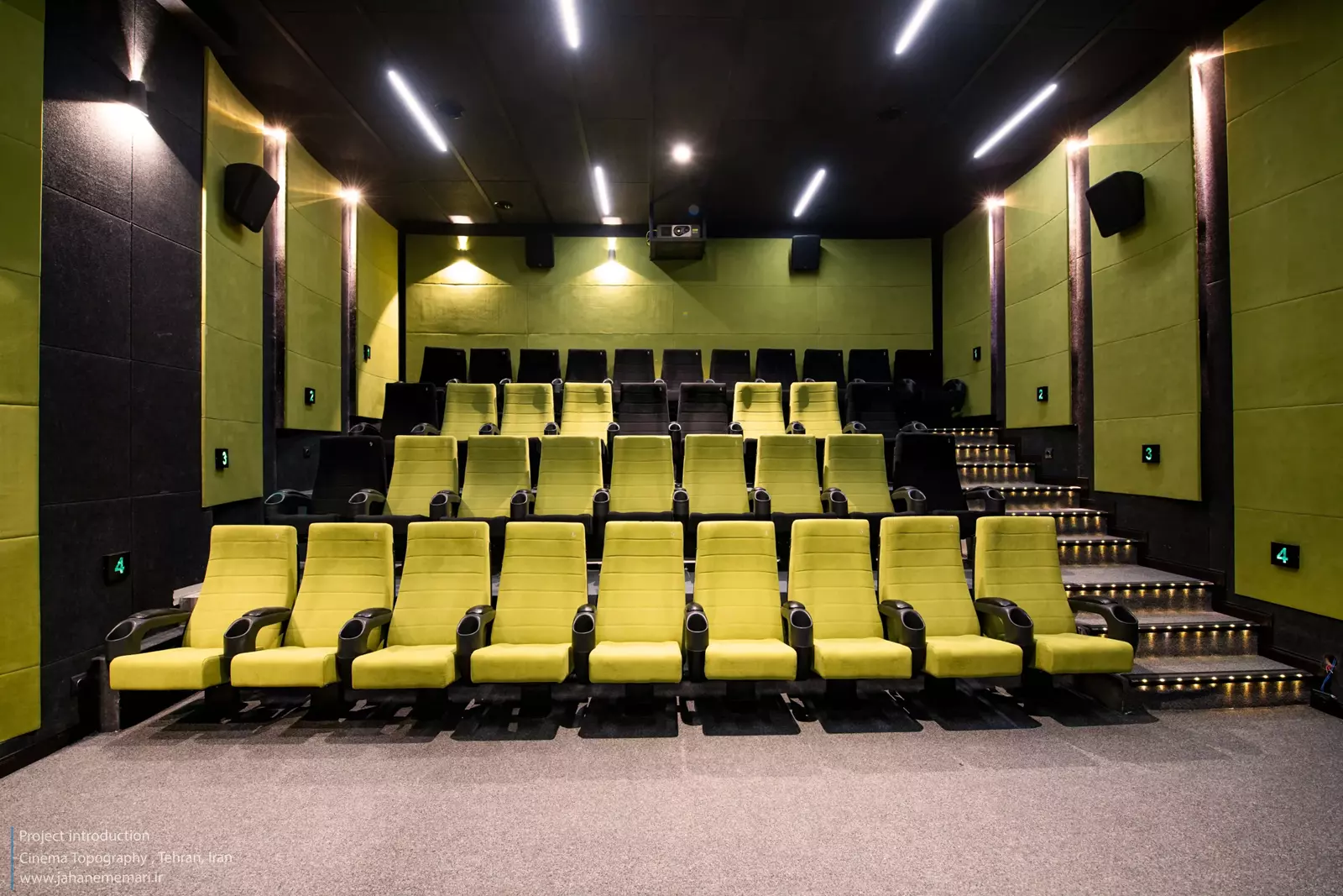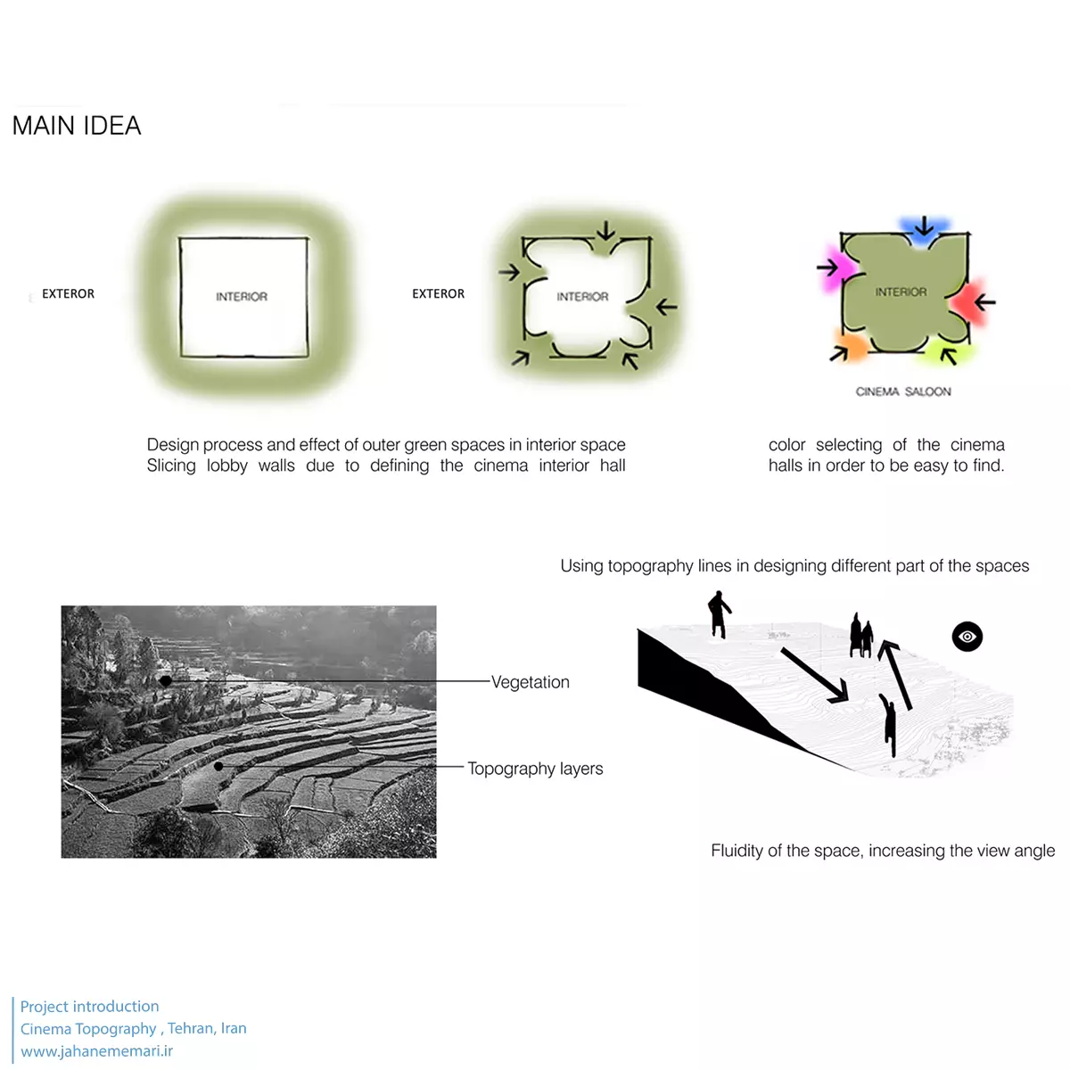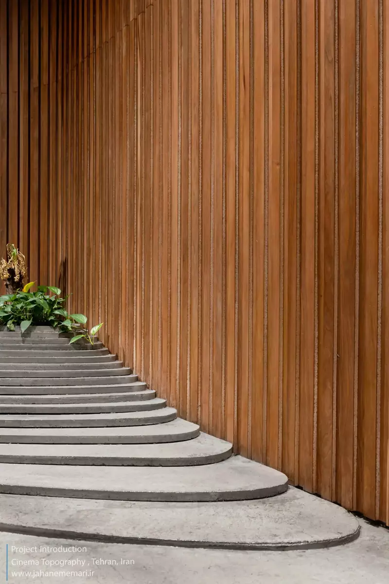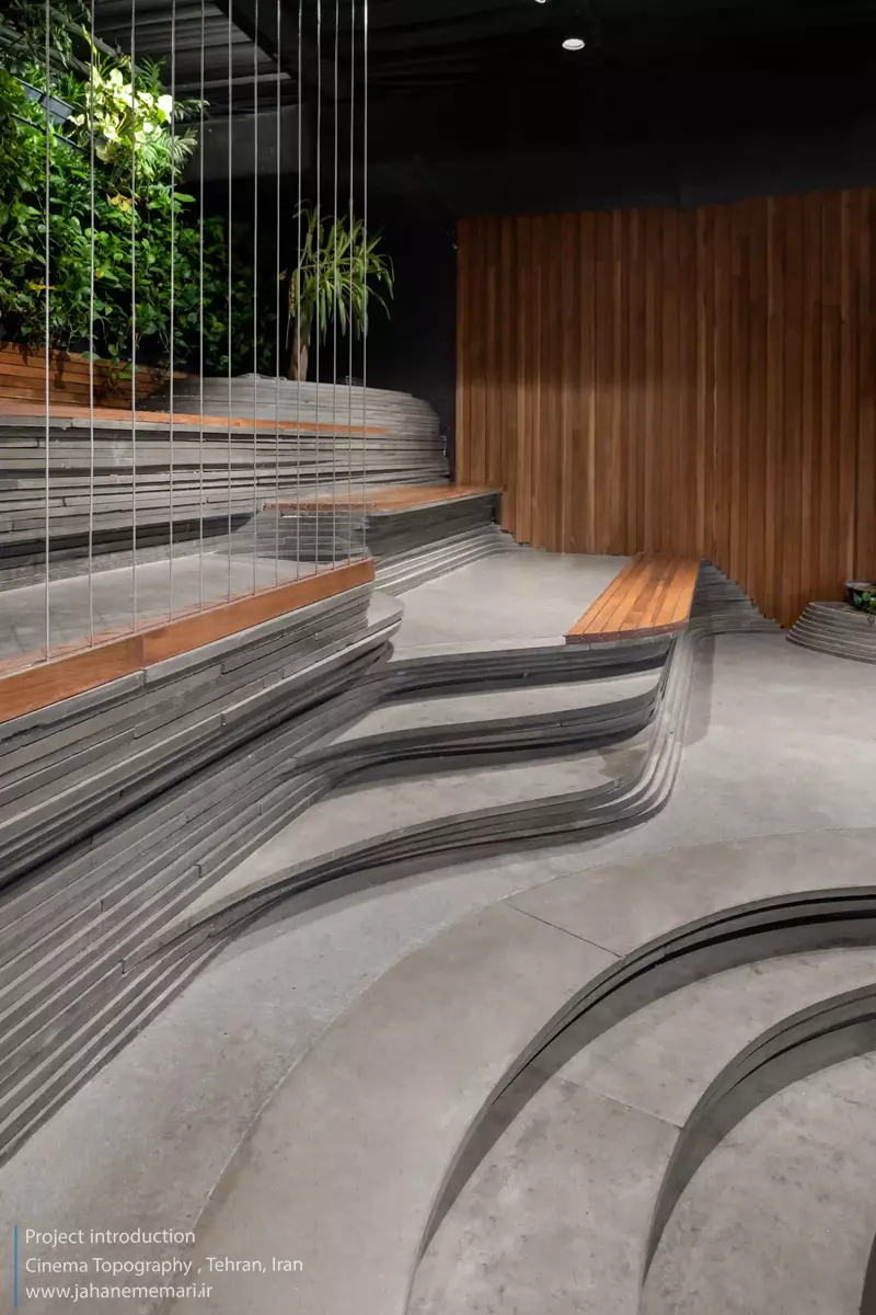 فرم خطوط توپوگرافی در طراحی ابژه های عملکردی همچون، کانترهای بلیط فروشی و تنقلات و گلدان هایی که در قسمت های مختلف لابی طراحی شده نیز استفاده شده است. شبیه سازی محیط طبیعی و خلق یک لنداسکیپ داخلی با طراحی دیوارهای سبز، جداره های منحنی سالن های سینما از جنس نوارهای چوبی، تقویت شده است.