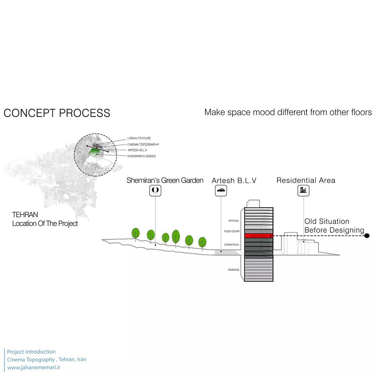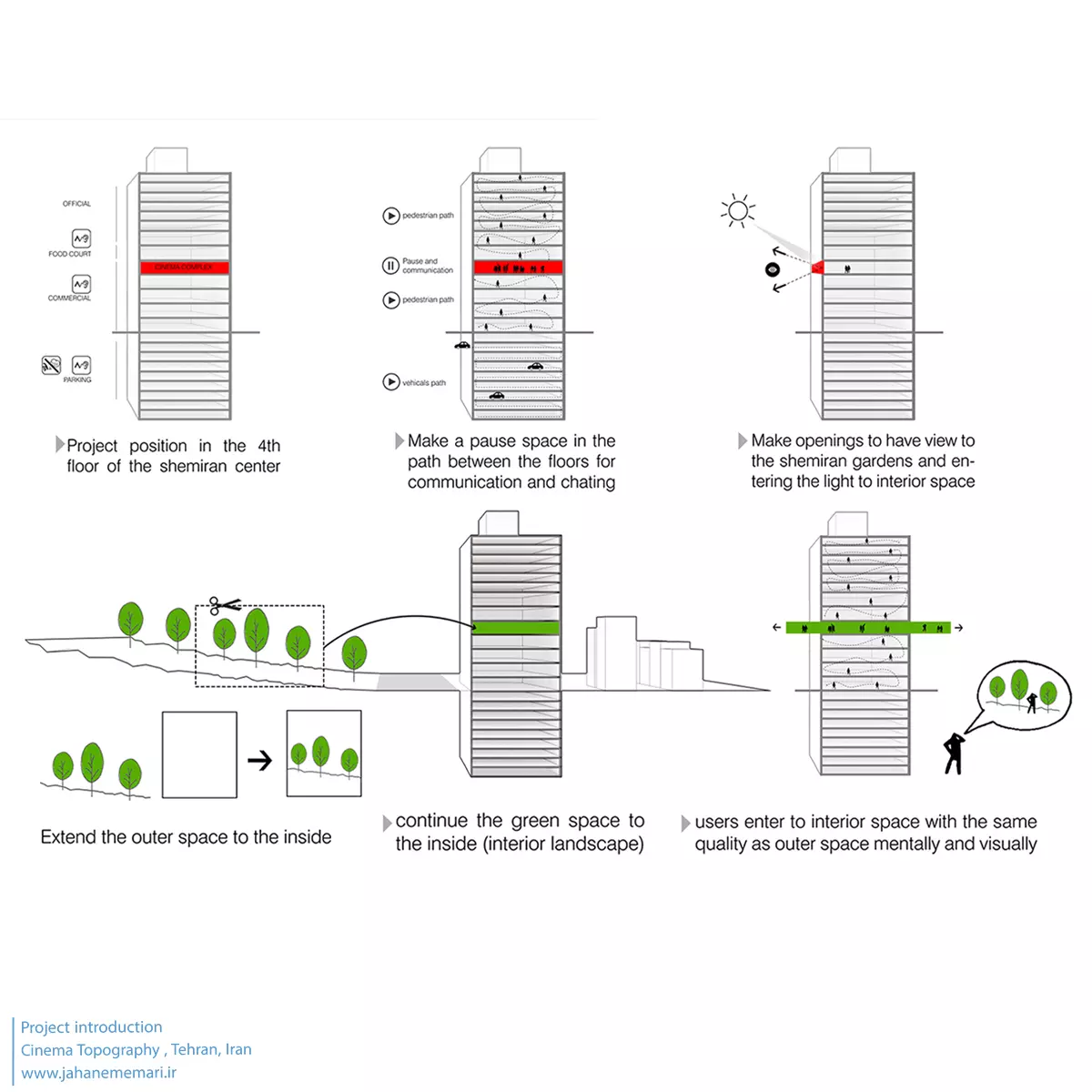 هدف اساسی درطراحی مجموعه فرهنگی و سینمایی شمیران خلق یک نقطه عطف به عنوان حلقه واسط سایر طبقات با ایجاد فضایی متفاوت با آن ها بود. به صورتی که شهروندان که در طبقات دیگر در حال رفت و آمد و حرکت هستند هنگامی به این طبقه می رسند با فضای مکثی مواجه شوند تا قدری درنگ کنند ، سعی شد تا حد ممکن عناصر طبیعی موجود در طبیعت اطراف به محیط داخلی وارد شود. بدین جهت متریال های طبیعی همچون پوشش گیاهی و چوب جایگزین مصالح سخت گردید همچنین در این طرح، می خواستیم یک پاتوق فرهنگی را به صورت یک چشم انداز طبیعی در مقیاس خرد تر، در فضای داخلی ایجاد کنیم. در واقع تلاش بر این بود که افراد پس از حرکت در سایر طبقات، یک باره، در طبقه چهارم تجربه محیط طبیعی خارجی را به گونه ای داشته باشند که بتواند موجب افزایش نوعی از هیجان در فضا شود و باعث گفتمان بیشتر شهروندان گردد که ماحصل آن رشد و ارتقای سطح فرهنگی خواهد بود.