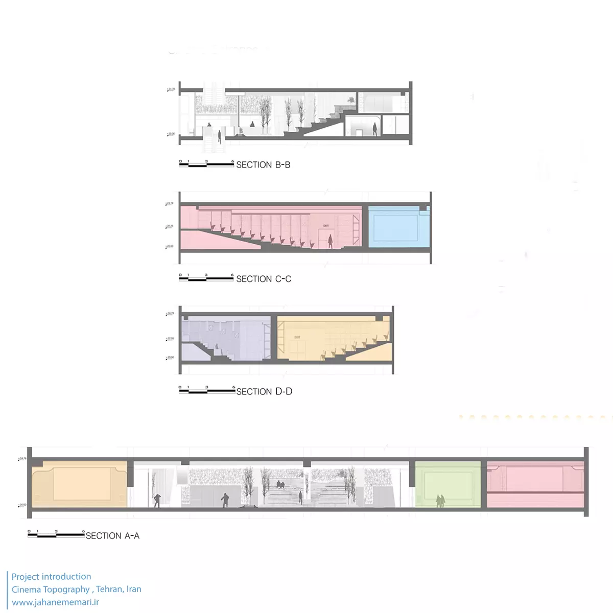 به منظور ایجاد یک هویت متمایز برای هریک از سالن های نمایش یک رنگ مشخص در نظر گرفته شده است. این رنگ در درب های ورودی و طرح داخلی هر سالن دیده می شود.