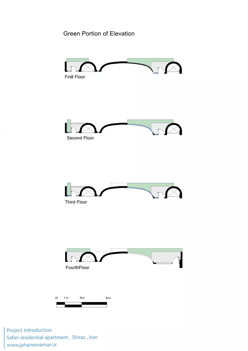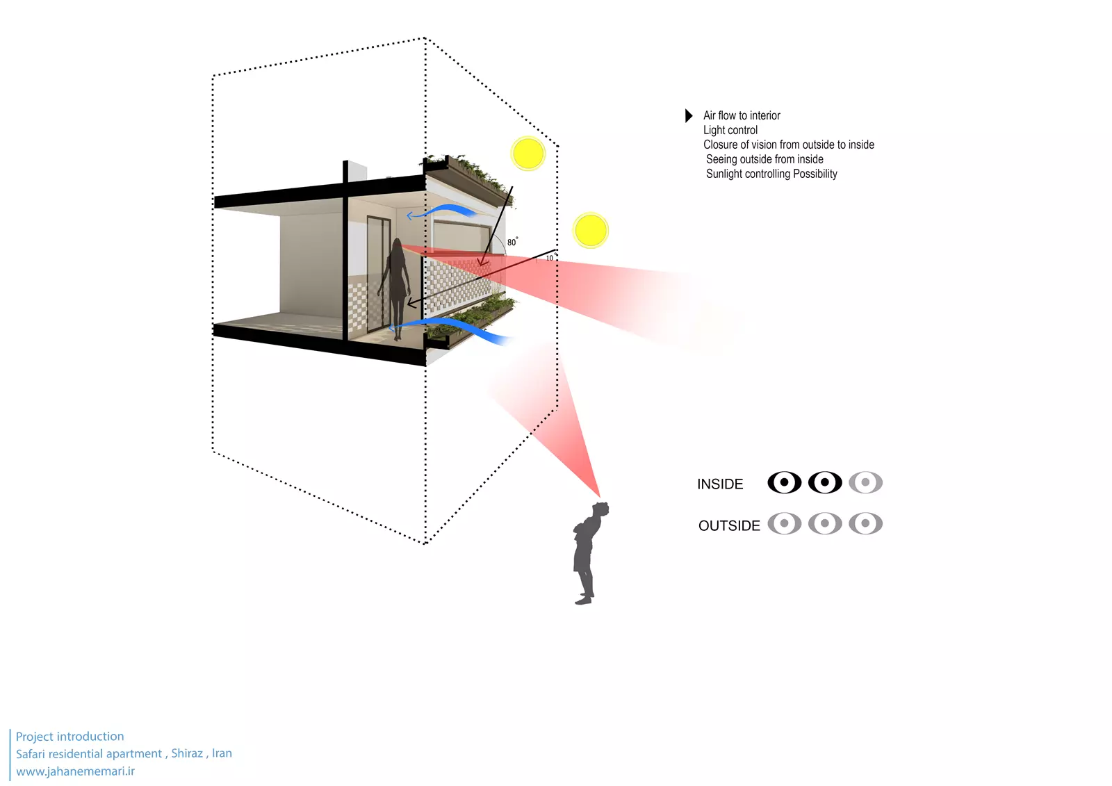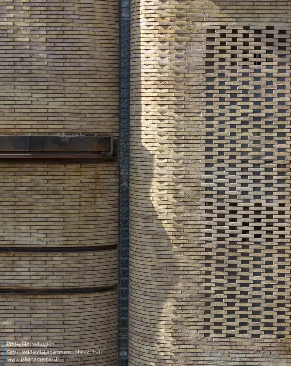 همچنین دیوارهای شخصی(اتاق ها) با یک عقب نشینی کوچک -درعین داشتن تراس- به سطح بالایی از حریم خصوصی رسیده اند. تشکیلات نمای سه بعدی به ایجاد سلسله مراتب و تشخیص نواحی خصوصی و عمومی واحدهای مسکونی در نمای بیرونی کمک می کند. با توجه به محدودیت هایی که شهرداری در غیاب اشرافیت با آن مواجه بود ما مجبور بودیم دید را به ارتفاع ۱٫۷ متر متصل کنیم. ایده ما برای جذب حداکثر دید فضای بیرونی ایجاد پوسته آجری متخلخل و ترکیب آن با نما بود. ساخت این دیوارهای آجری، علاوه بر دید مستقیم از بیرون، باعث شده است ساکنان در حین استفاده از فضاهای ساختمان از بیرون دیده نشوند. زیر این دیوارهای شبکه ای باز است و نوارهایی برای رشد گیاهان گذاشته شده اند که به خوبی دید را محدود می کنند. با استفاده از نور طبیعی به جای روشنایی بی شکل و فرم تلاش کردیم با ایجاد کنتراست نوری و عبور آن از “فخرو مدین” حالت احساسی در ساکنان به وجود بیاوریم. به علاوه در طول شب، روشنایی داخل از بیرون در ایجاد دید و تجسم بصری کمک می کند. به علاوه با گذاشتن دریچه های آجری – به منظور دنبال کردن و انتقال نور طبیعی- در بخش های آجری نما با چرخاندن حدود ۲۰ درجه آجر ها بر روی قوس ۱۸۰ درجه ای، سعی شده تا با نور و سایه ها بازی شود و در نهایت پویایی و تغییر به وجود بیاید.