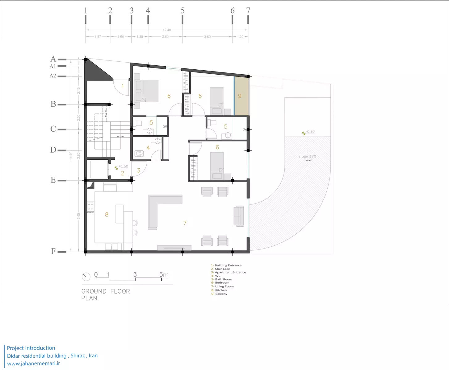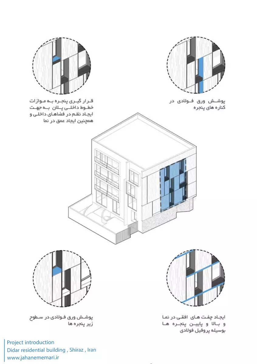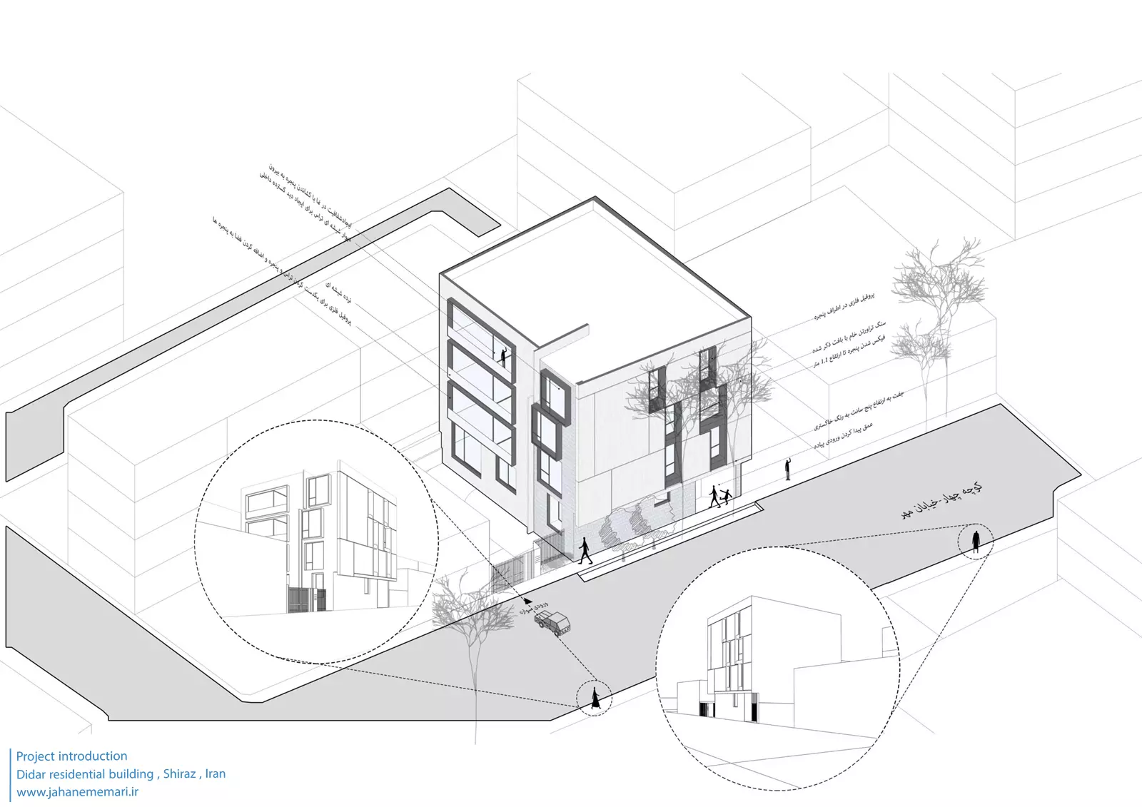 دیدار از گونه از پروژه های میان بافتی (infill) می باشد که عموما شهرها با این گونه پروژه ها شکل گرفته اند. در این پروژه تلاش کردیم پاسخ متفاوتی به این گونه از آپارتمانهای مسکونی بدهیم که عموما درگیر رویکردهای سختگیرانه اقتصادی هستند.